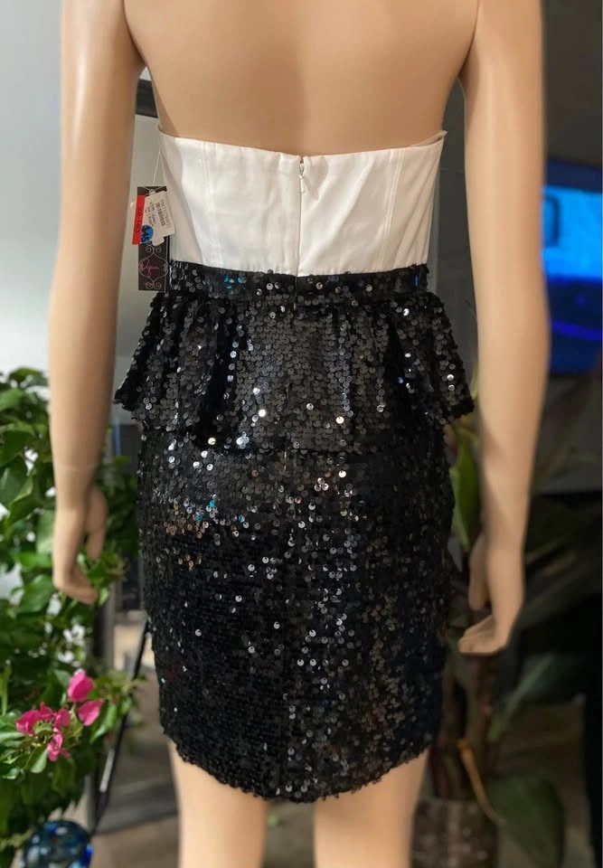 NWT: Aqua Black Ivory Satin Bustier Sequined Peplum Strapless Cocktail Dress (Size 6) 508