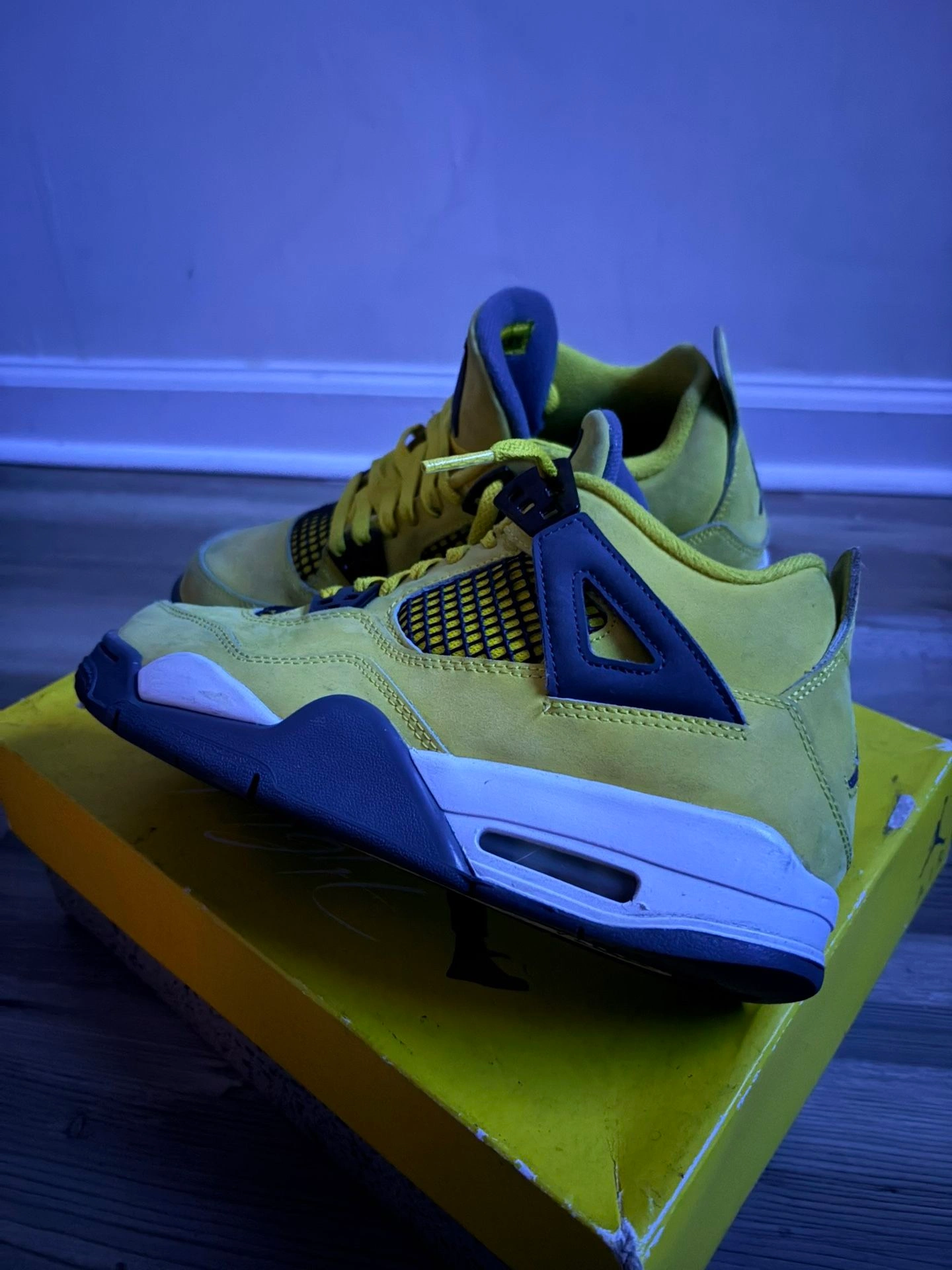 Two Jordan 4s, good condition, worn 2-3 times, come with the boxes. Jordan color ways are Jordan 4 Lightnings and Jordan 4 thunders. Both are $180, but I can negotiate to go lower. Size 6.