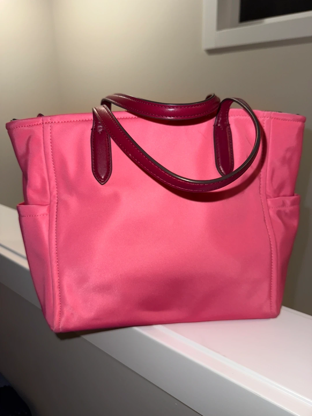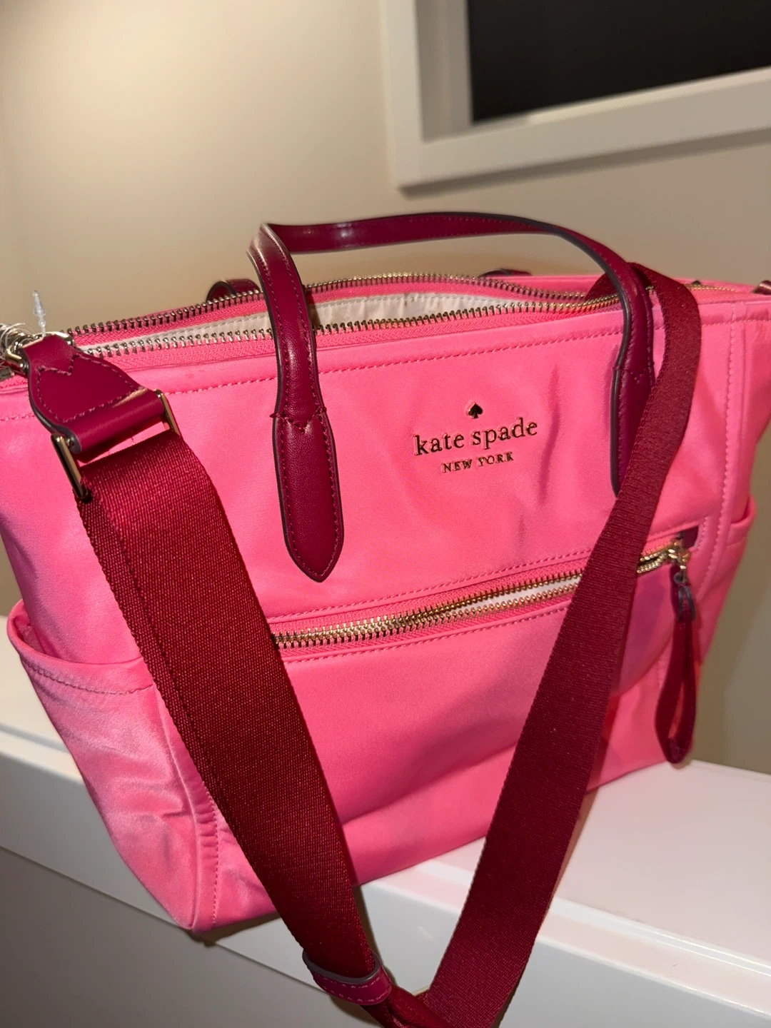 I'm selling a cute Kate Spade tote bag in a vibrant pink color! It features a contrasting red shoulder strap and handles, adding a stylish touch. Perfect for everyday use and carrying your essentials in style!