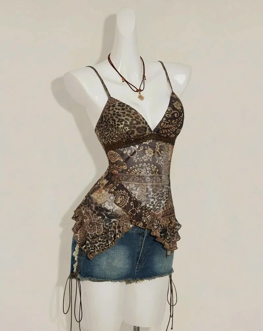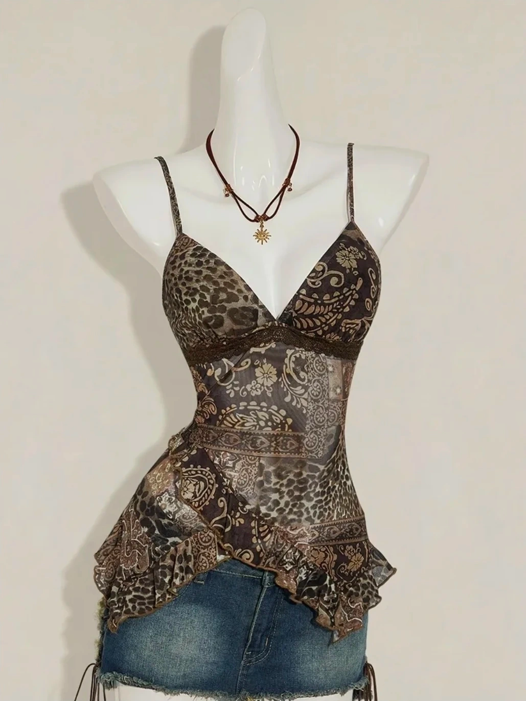 Y2K Mixed Print Ruffle Cami Top | Leopard & Floral