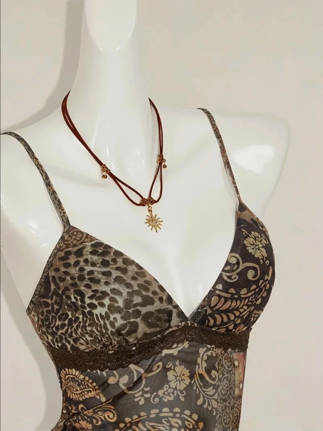 This unbranded camisole is the ultimate Y2K throwback, featuring a stunning "Whimsygoth" mix of leopard print and vintage-inspired florals. The tiered ruffle hem and delicate lace trim add a perfect "Mob Wife" meets "Grunge Fairycore" aesthetic to your closet.