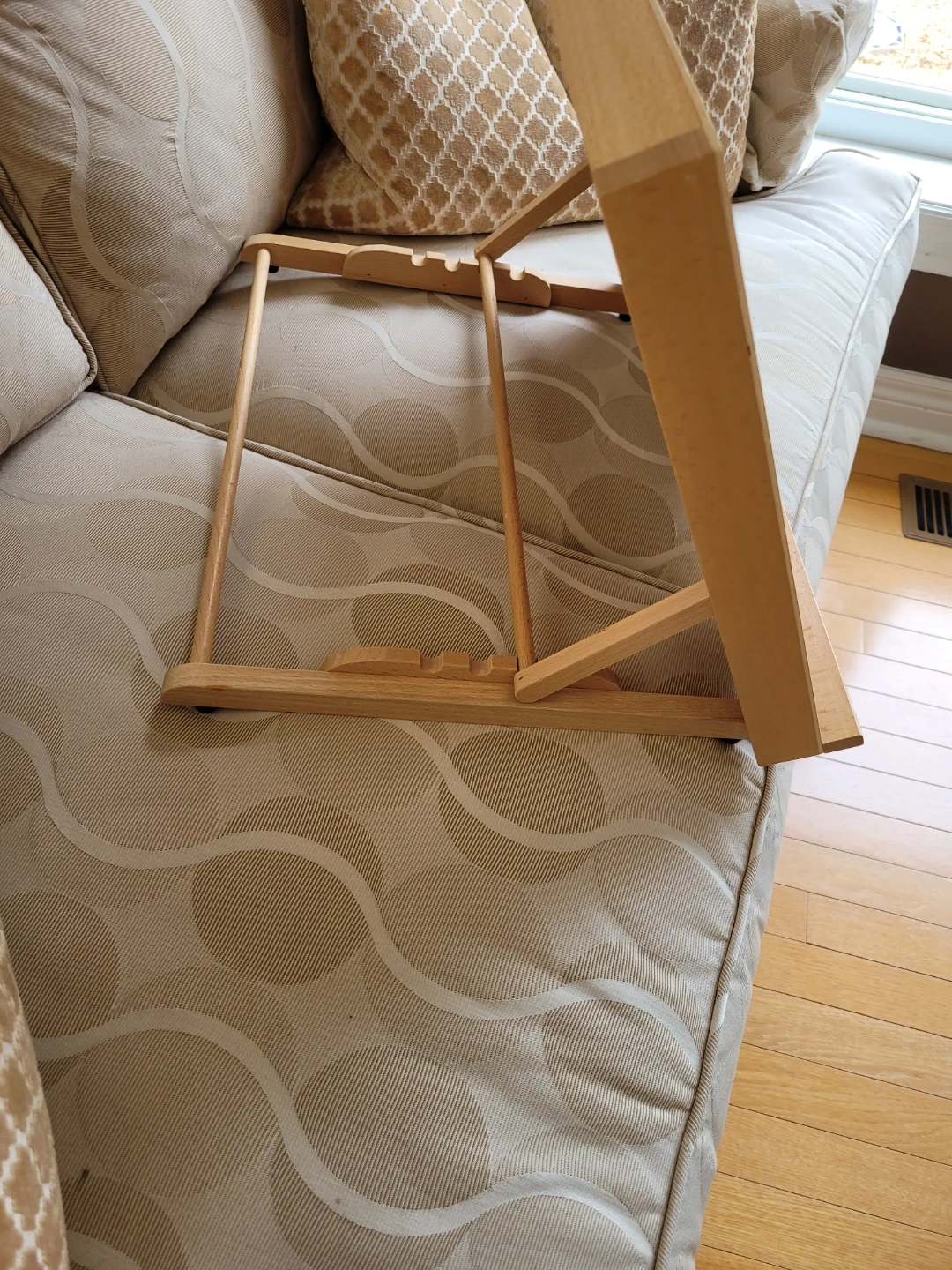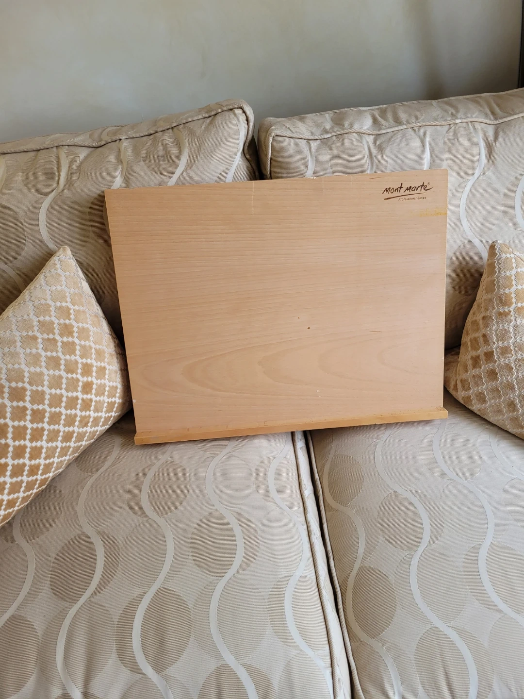 This is a Mont Marte Professional Series wooden art easel. It's made of light-coloured wood and folds flat for storage. The easel has adjustable supports for holding canvases or drawing boards.
