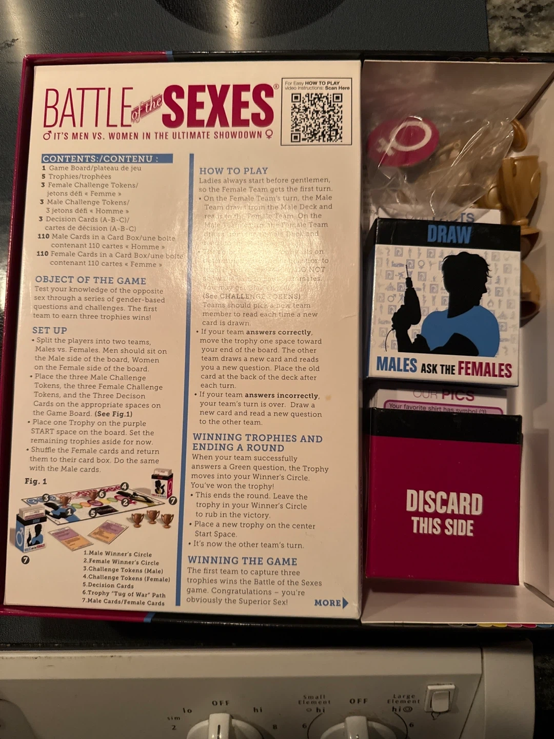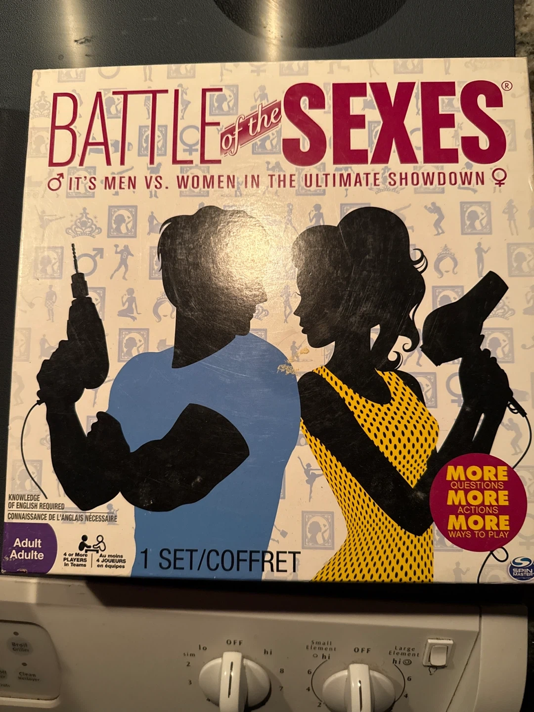 Selling a complete Battle of the Sexes board game! It's a fun game for adults and includes everything you need for the ultimate showdown between men and women. Includes trophies, tokens, challenge cards, and more to test your knowledge and skills