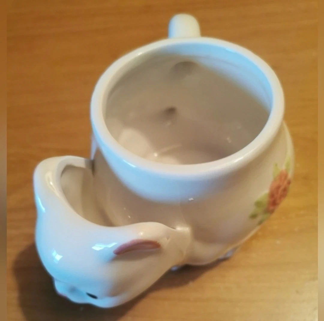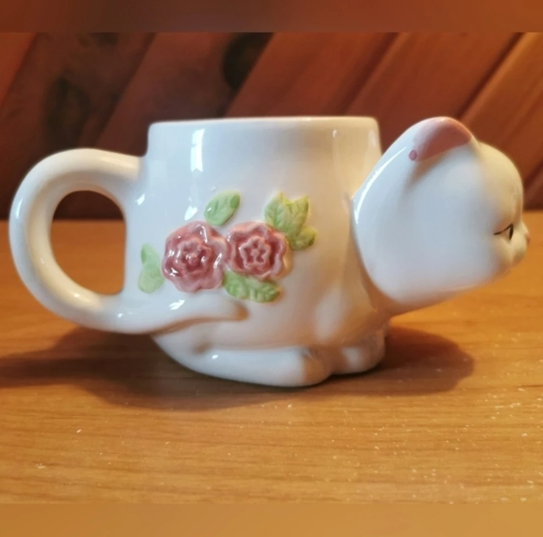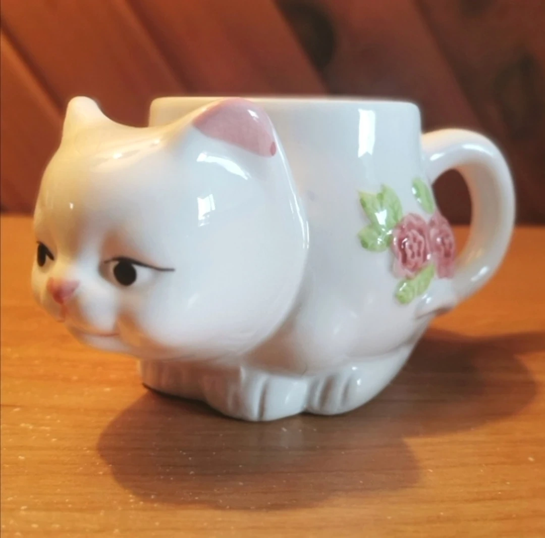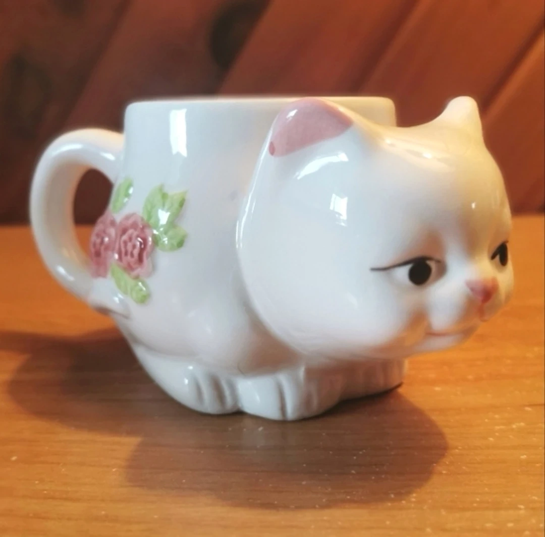 Vintage 3D White Cat Mug With Pink Roses.