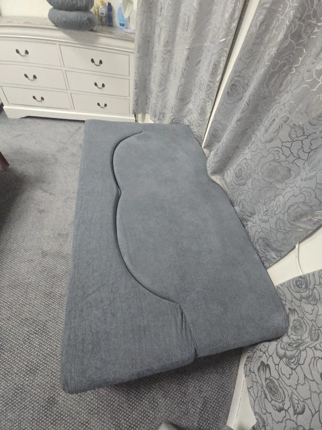 This is a gray upholstered sofa with a unique curved design and two round accent pillows. The fabric appears to be a textured weave. Its modern shape makes it a statement piece for any living space.