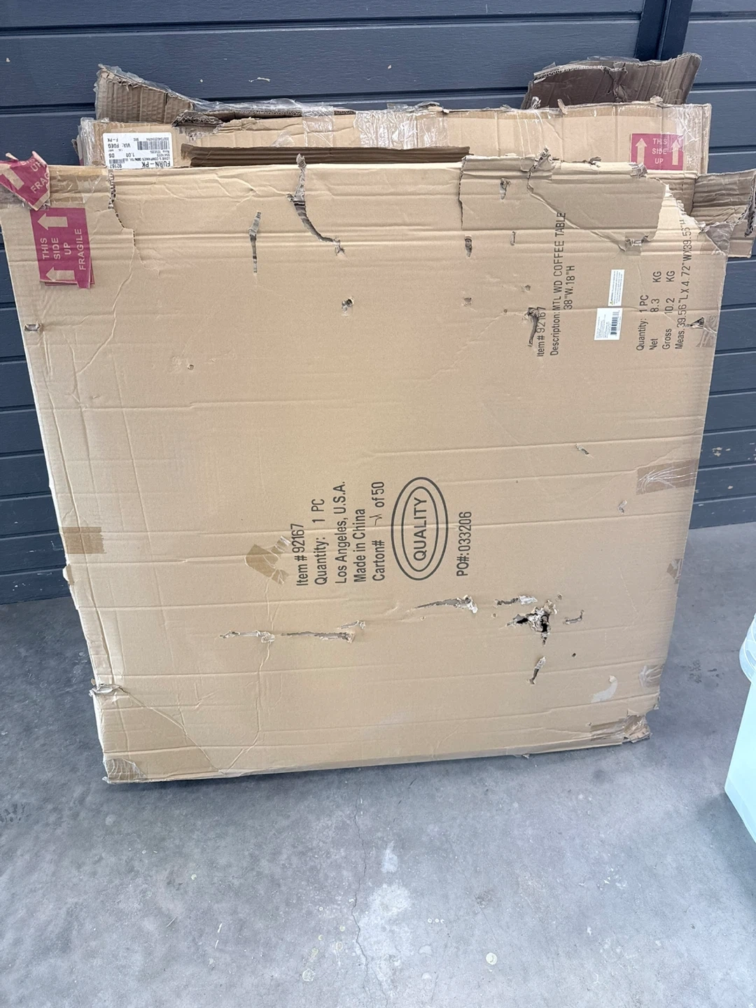 Selling a round coffee table, still in its original packaging! The box says it's 36 inches in diameter and 18 inches high. It's a really nice piece, but it doesn't quite fit my space