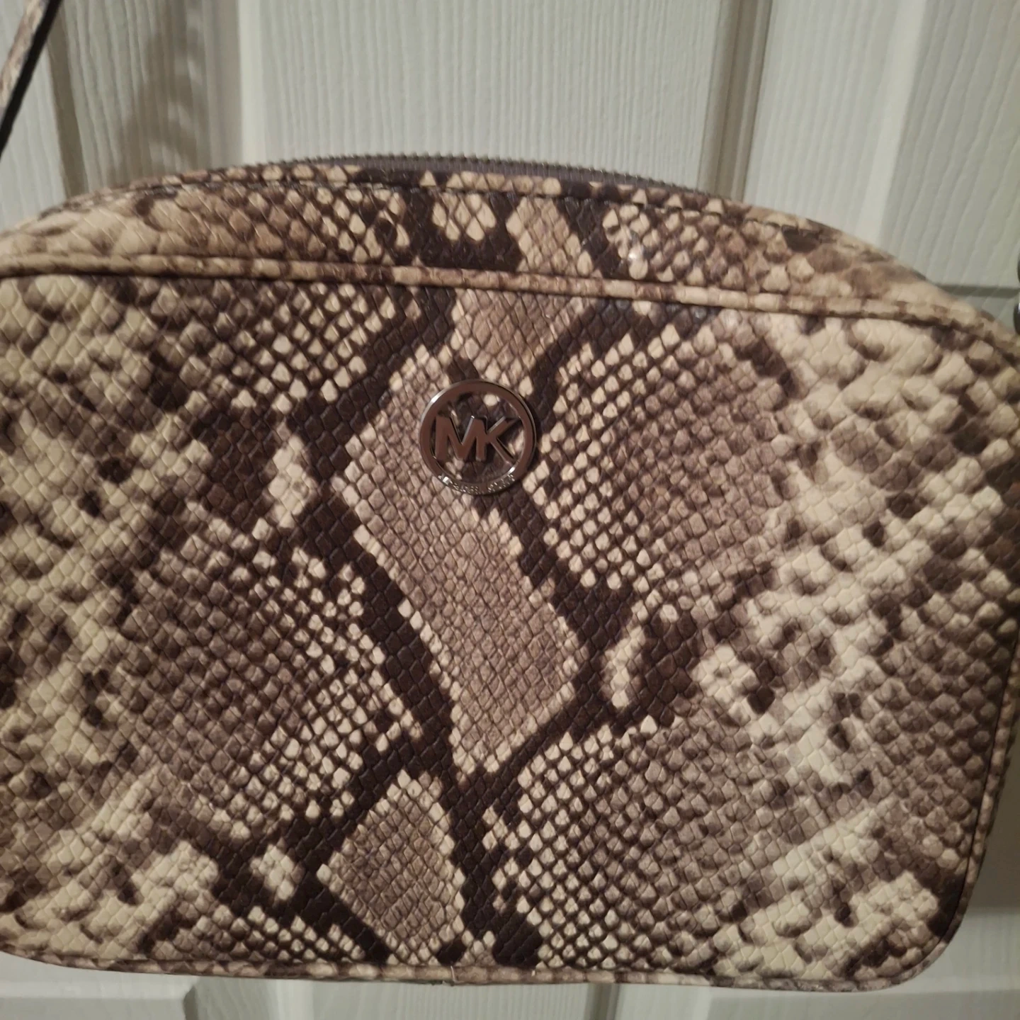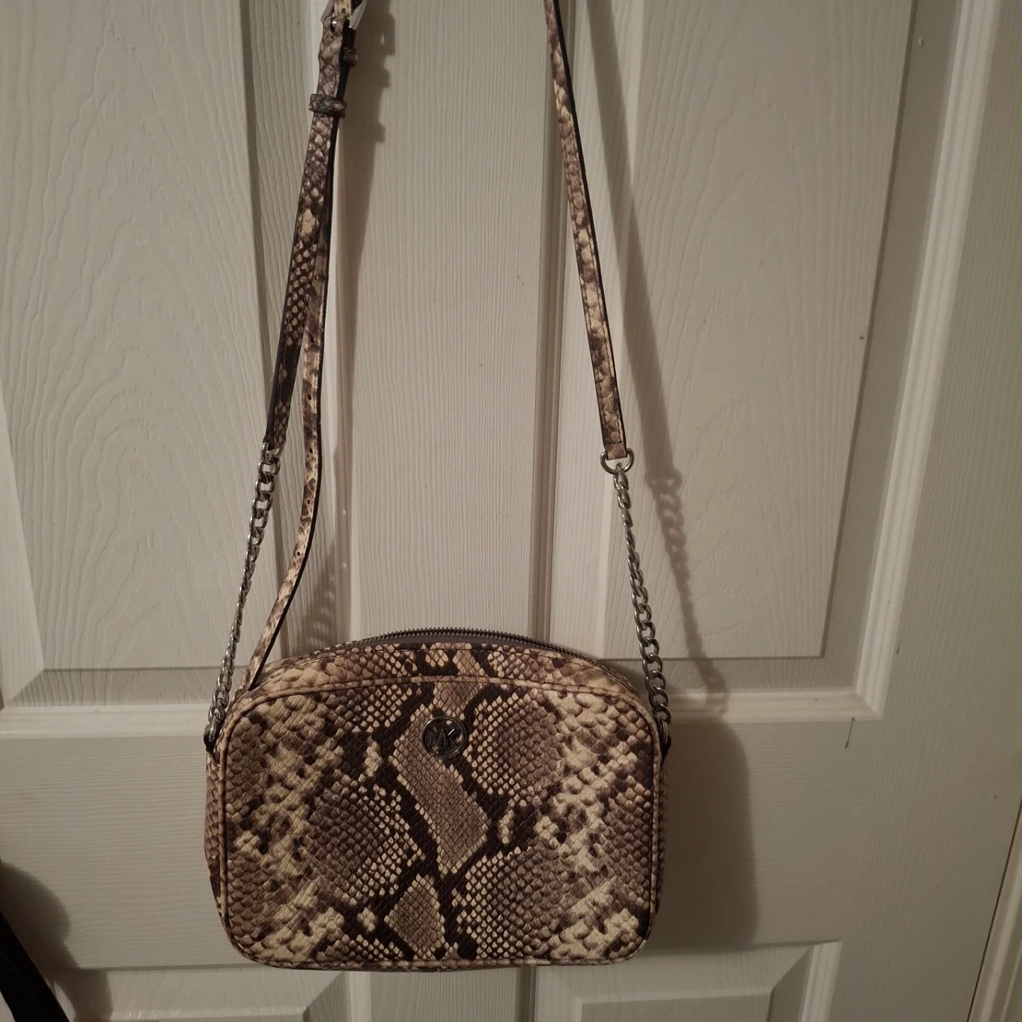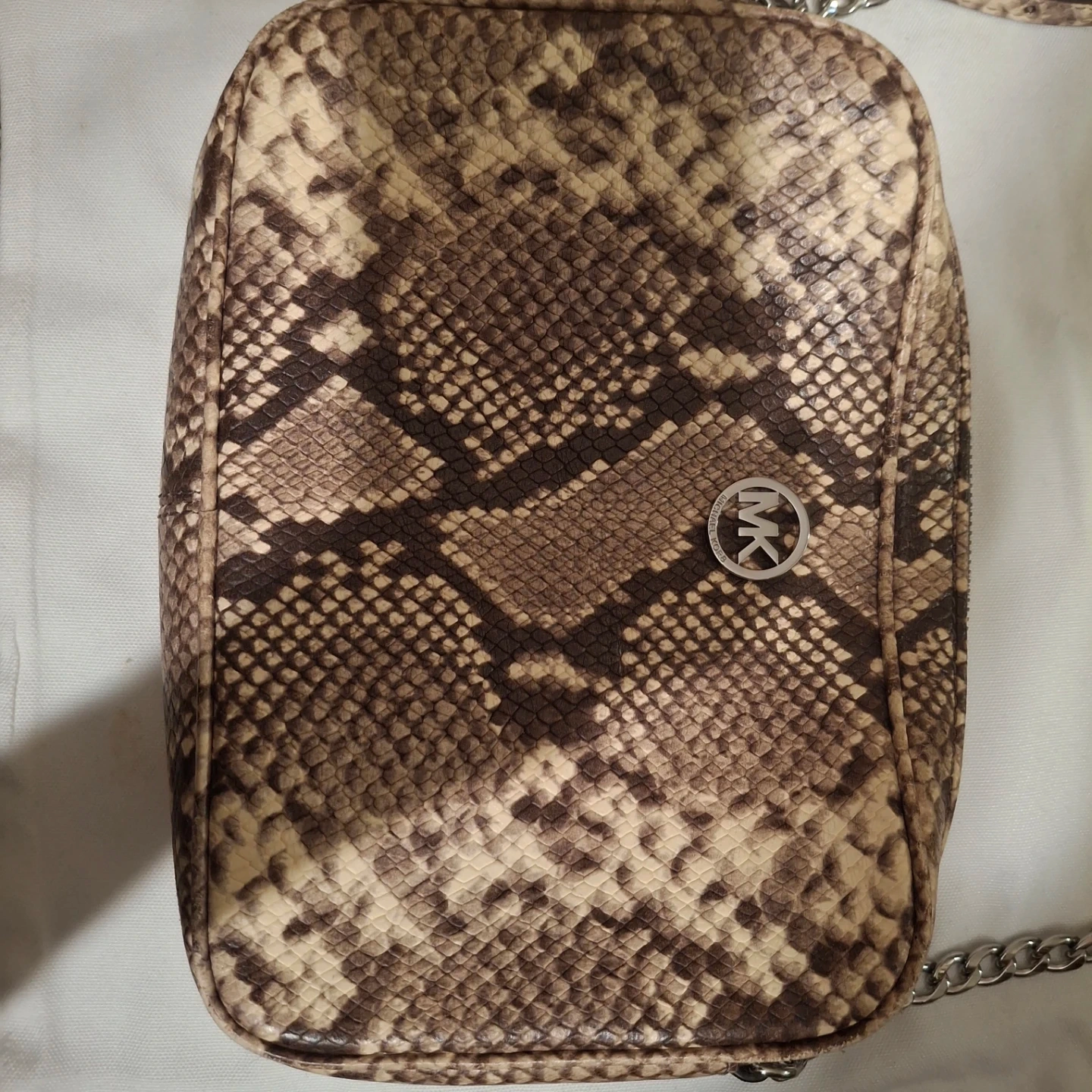 This Michael Kors crossbody bag features a stylish snake print. It has a silver-tone chain strap and zip closure. Great for adding a touch of flair to any outfit!