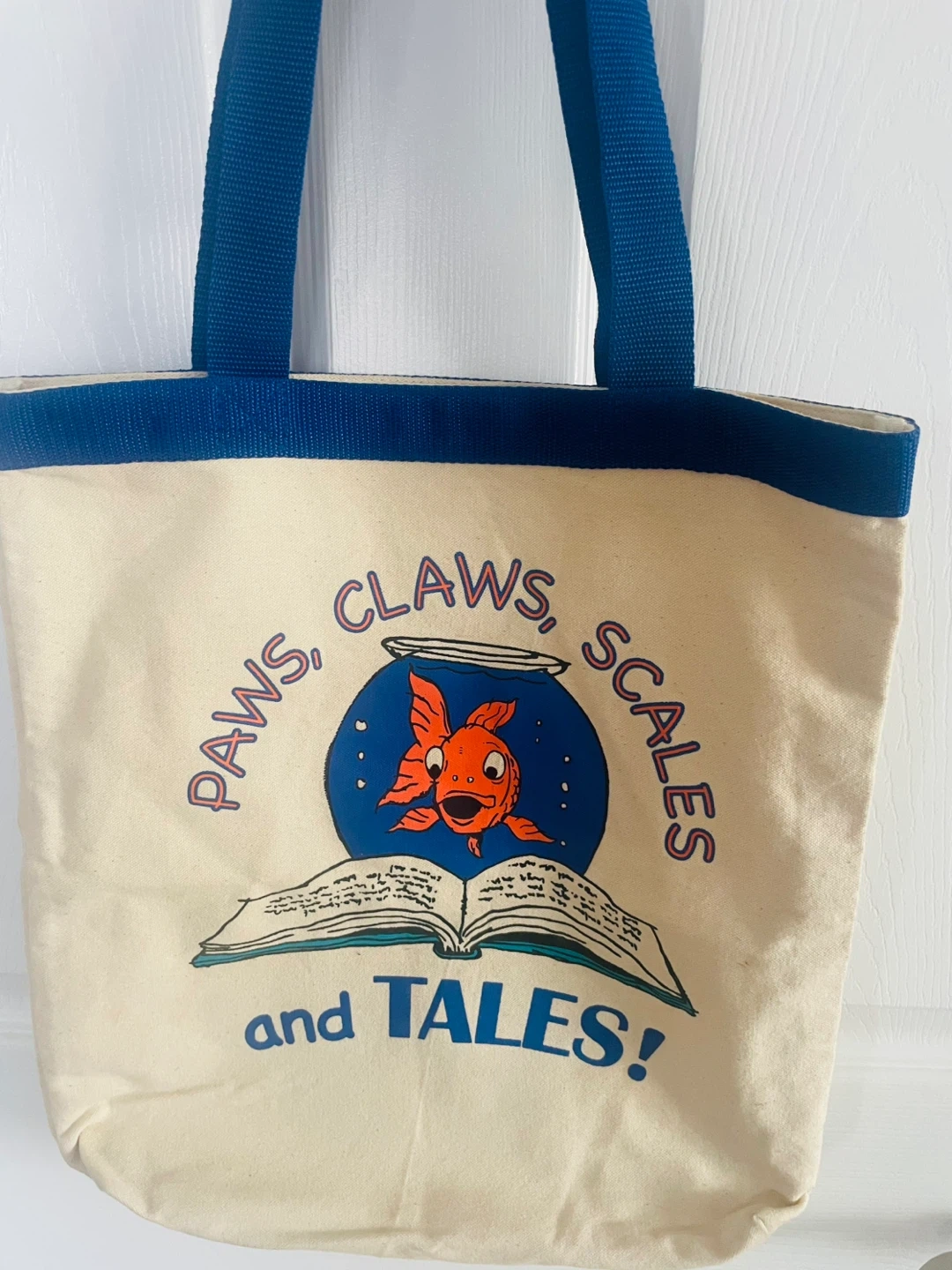 Canvas tote bag featuring a fun graphic with a goldfish and the phrase "Paws, Claws, Scales and Tales!". It has blue handles and a blue trim. Great for carrying books or groceries!