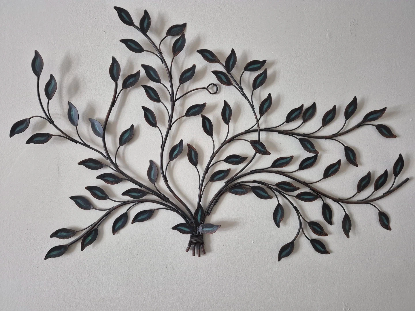 This metal wall art features a delicate branch design with numerous stylized leaves. It's crafted from dark metal with teal accents on the leaves. It's designed to be hung on a wall and adds a decorative touch to any room.