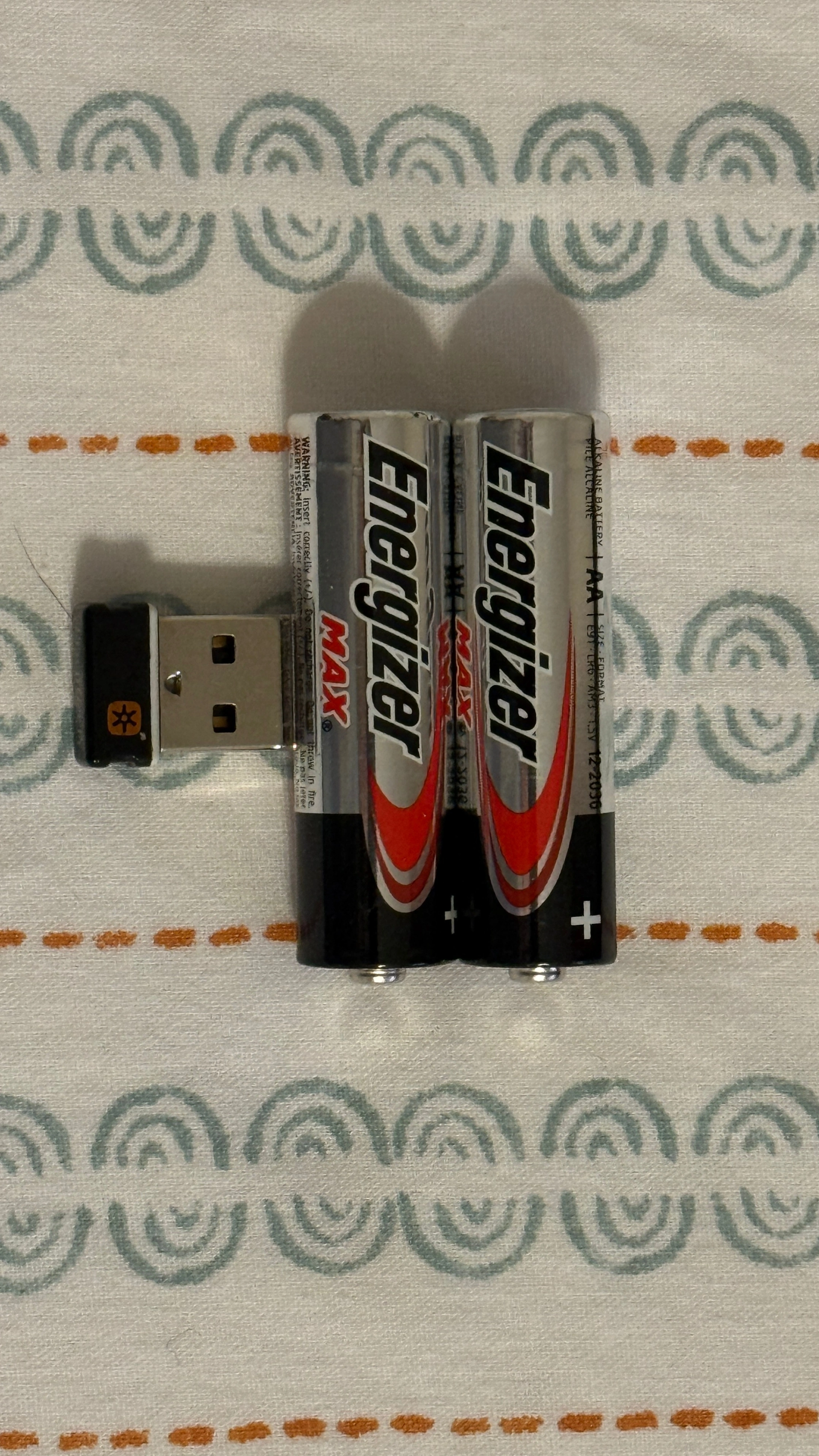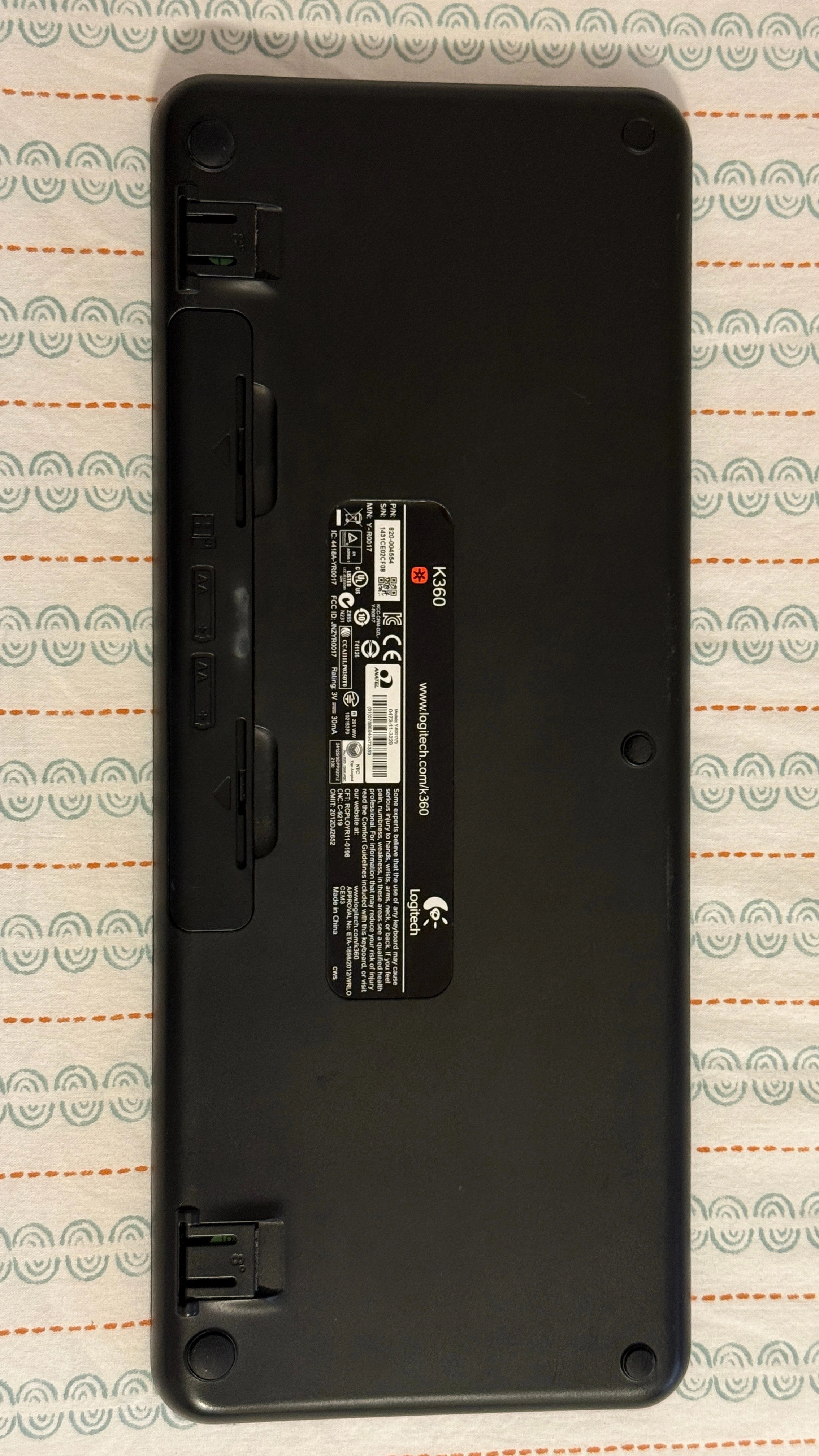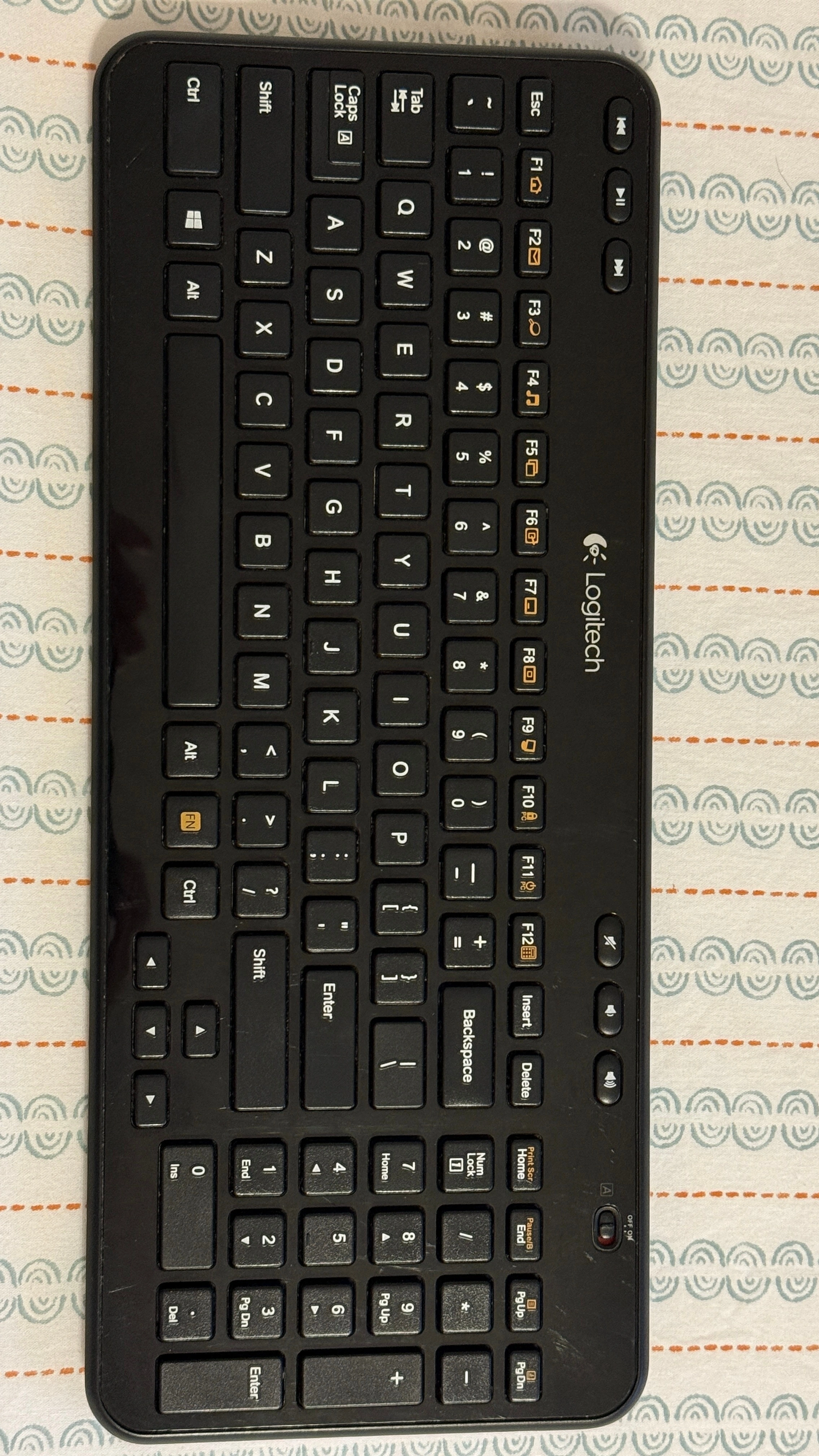 Black wireless keyboard. Has a full layout with function keys and a number pad. It is a great keyboard to sit and comfortably type all day long. Good condition and comes with the wireless receiver and fresh batteries.