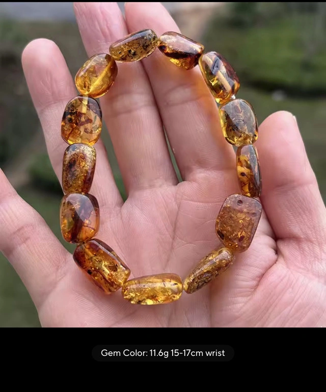 This never used Amber bracelet features natural gem colour, weighs 11.5g, and is designed to fit a 15-17cm wrist. It is a unique piece with each amber stone showcasing its natural inclusions and warm tones.
