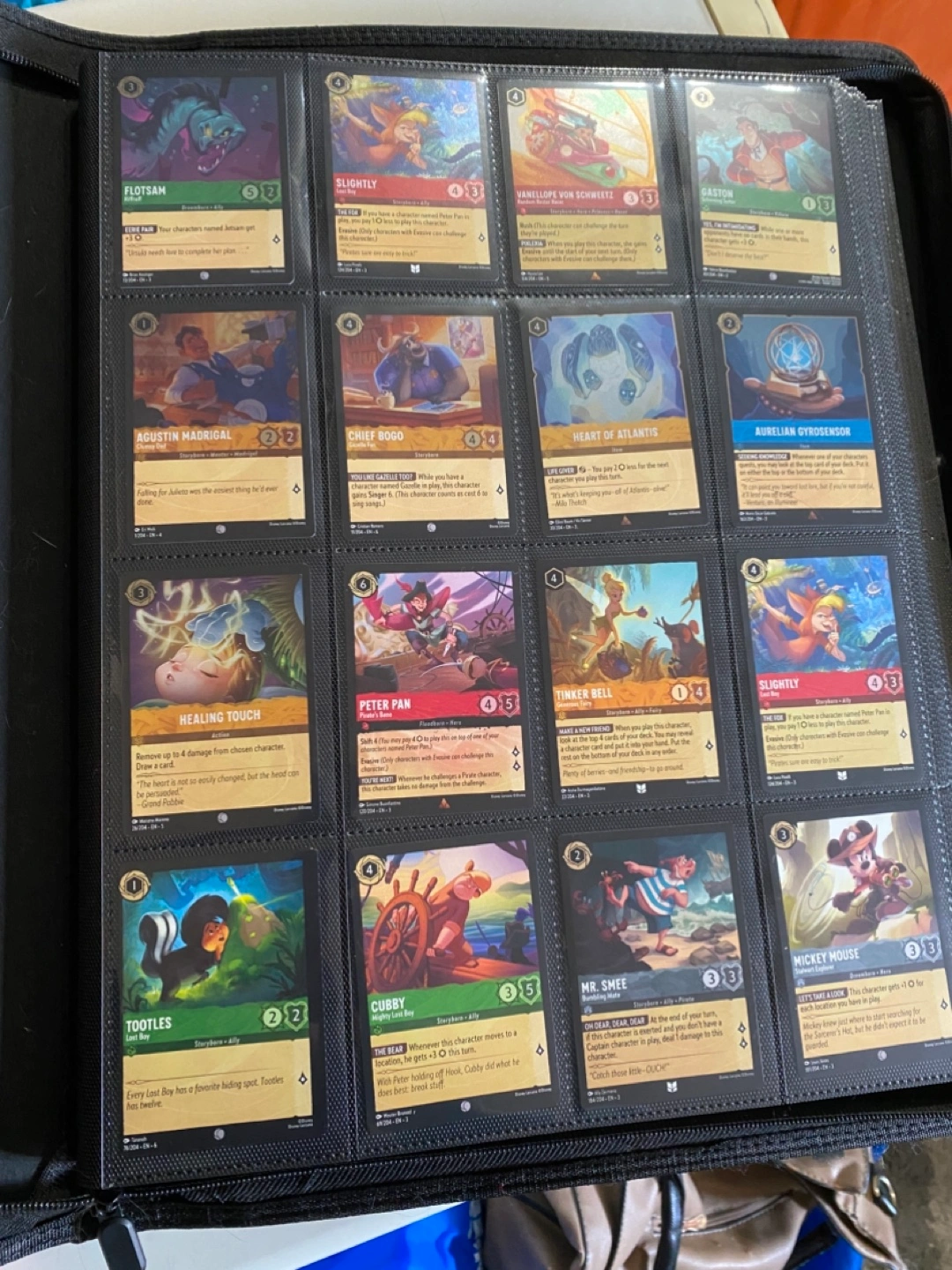 154 brand new out of package Disney Lorcana cards with a Lorcana binder and game mat. The first 8 cards are shiny and the last 5 cards are doubles.