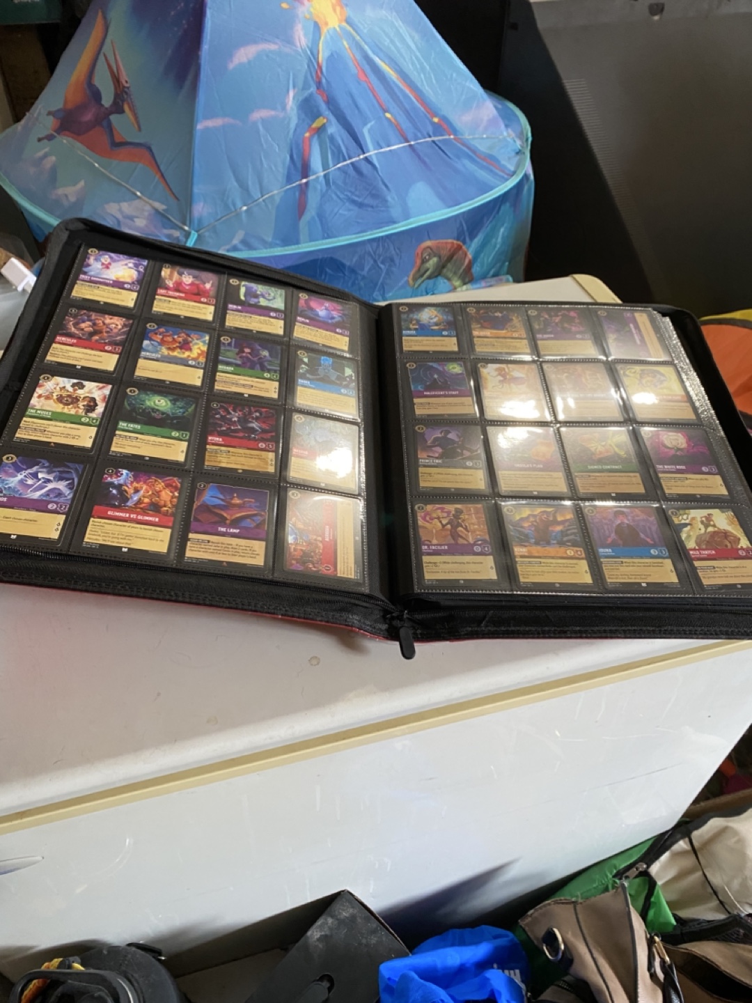 154 brand new out of package Disney Lorcana cards with a Lorcana binder and game mat. The first 8 cards are shiny and the last 5 cards are doubles.