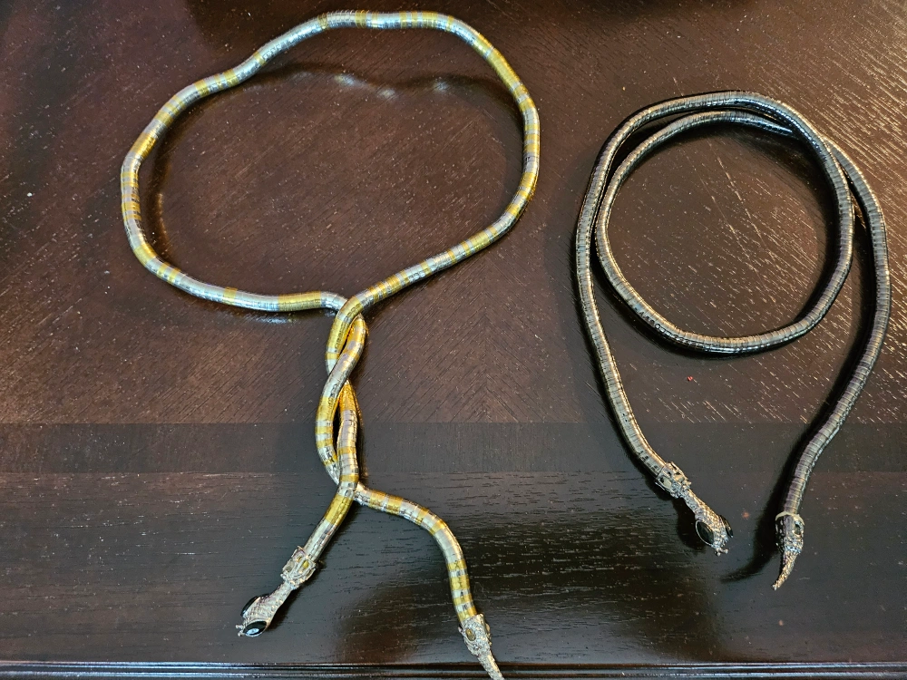Multiple colors of snake bracelet, or necklace or arm accent with green eyes. It is flexible and wraps around the wrist. Approximately 36" long. It has a snake head on each end. $4 each