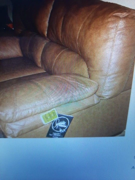 Tan leather loveseat with tags. Tan with orange tint. Approximate measurements: 38" depth, 38-39" height, 67.50-68.25" length. Local pick-up near Lefrak City in Corona, Queens, NY. Not entertaining Half-pricers.