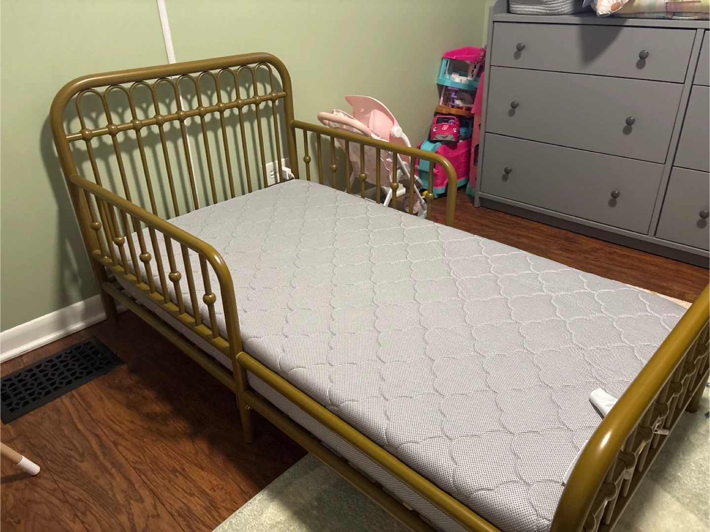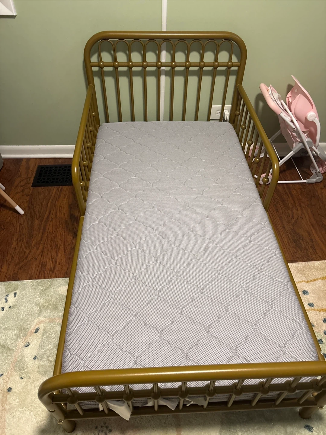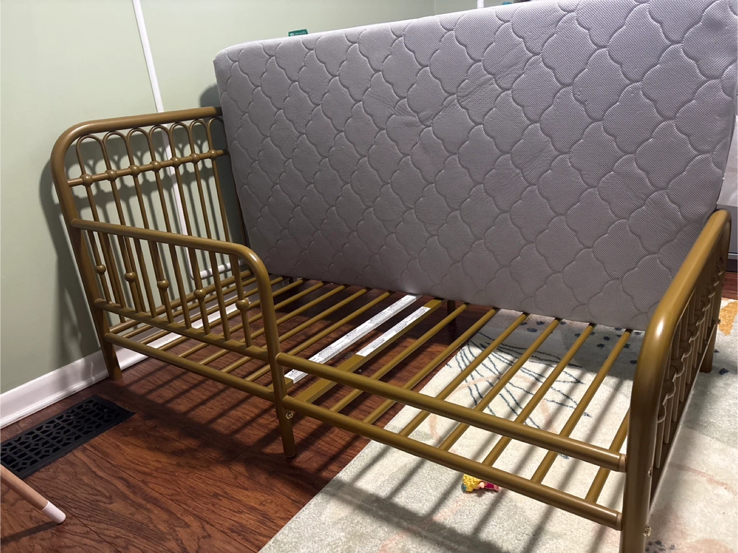 Gold toddler bed frame with a Newton Baby mattress, designed for baby and toddler use. It's a breathable and washable mattress. The cover is removable for easy cleaning. Also willing to sell items separately.