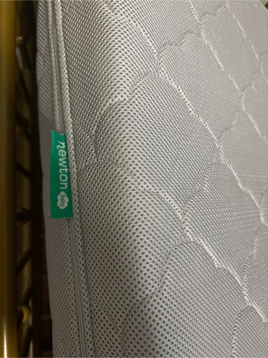 Gold toddler bed frame with a Newton Baby mattress, designed for baby and toddler use. It's a breathable and washable mattress. The cover is removable for easy cleaning. Also willing to sell items separately.
