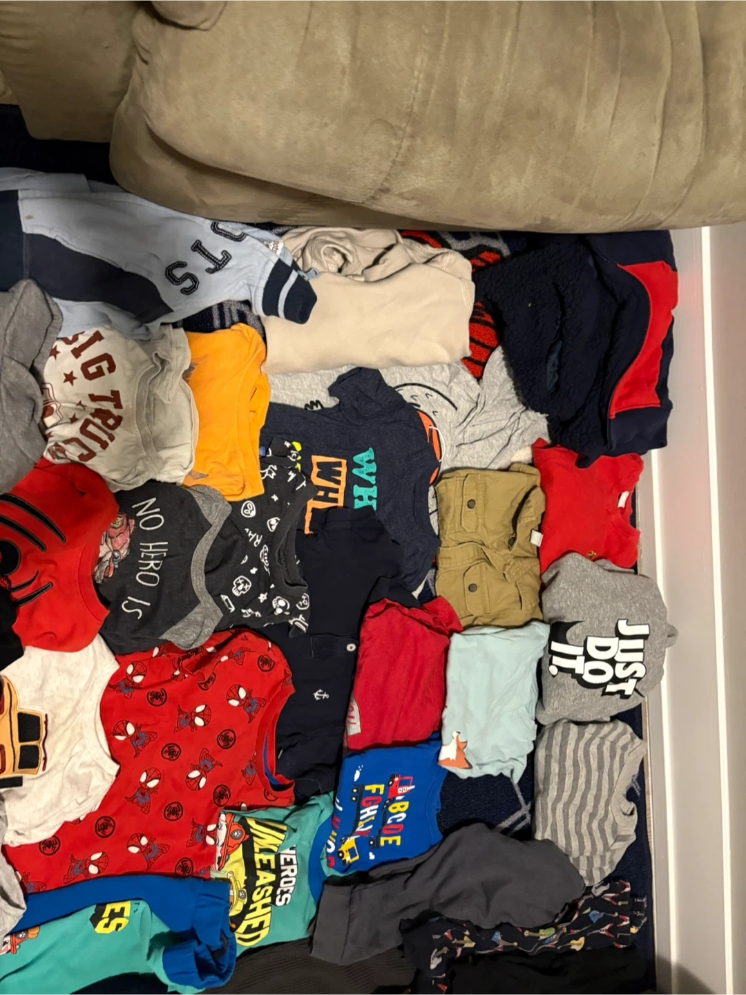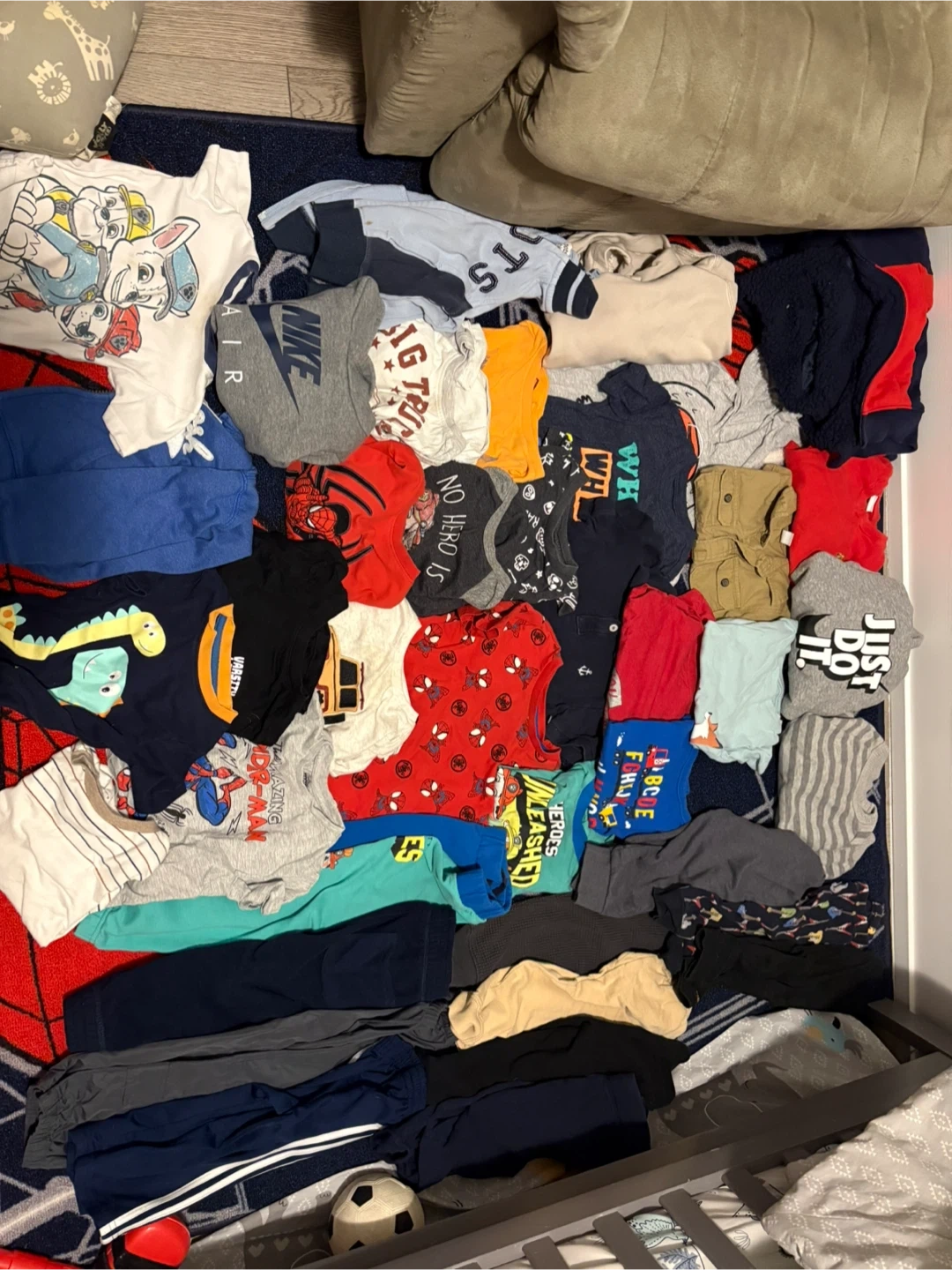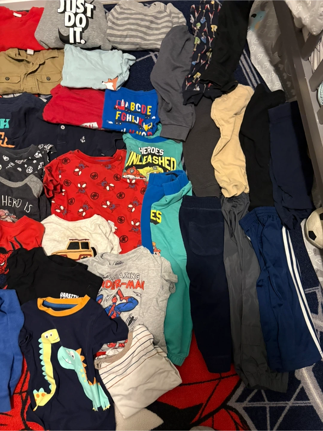 This is a bundle of various kids' tops and bottoms. Includes items with Spiderman, Paw Patrol, and dinosaur graphics. Some pieces are Nike brand. Lots of colours and styles for casual wear.39 pieces in total 2T