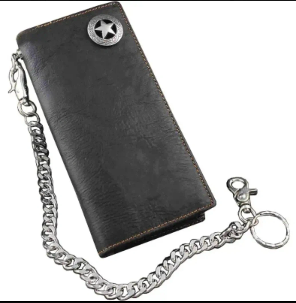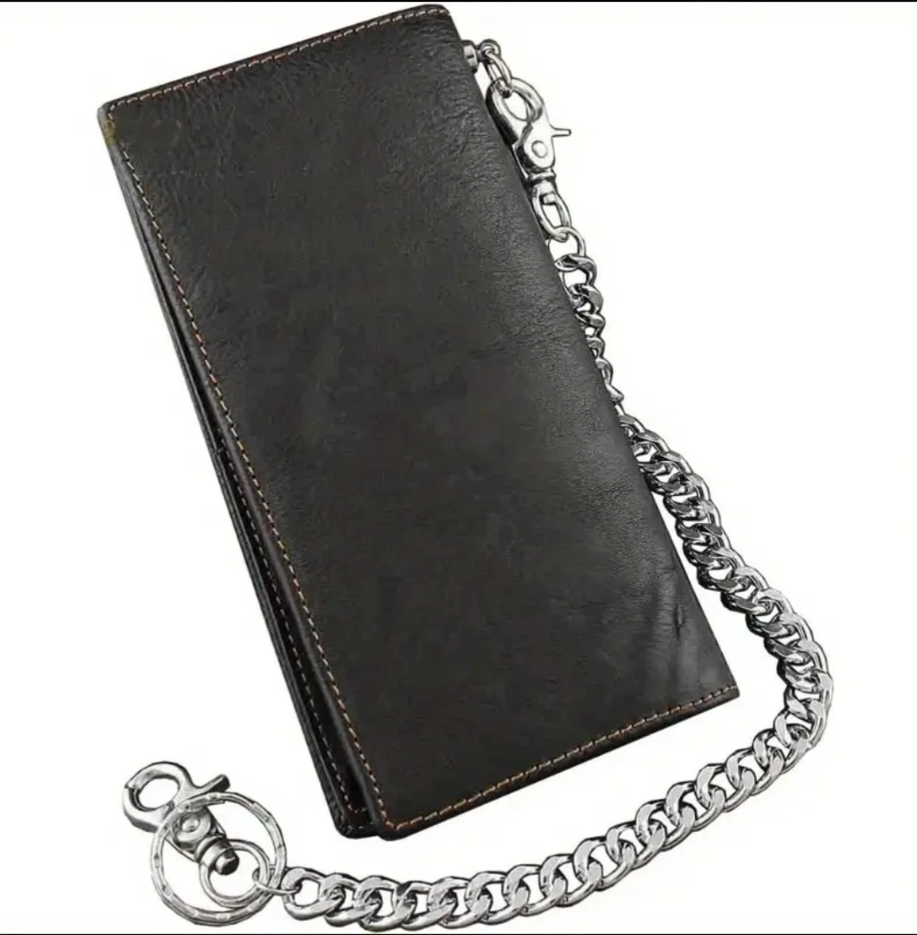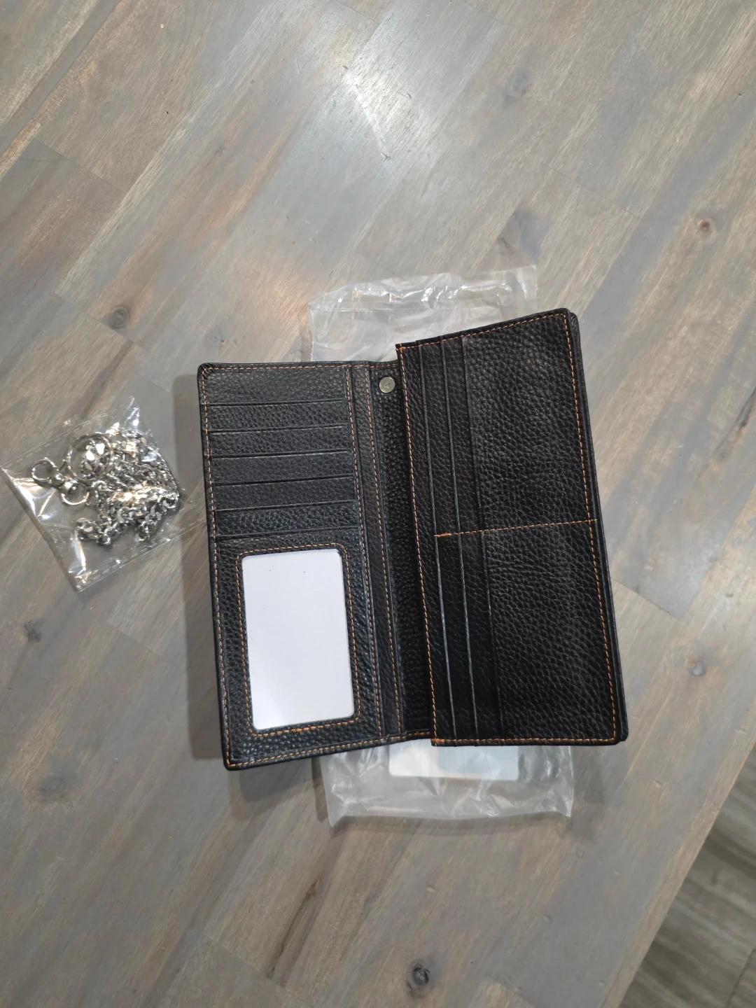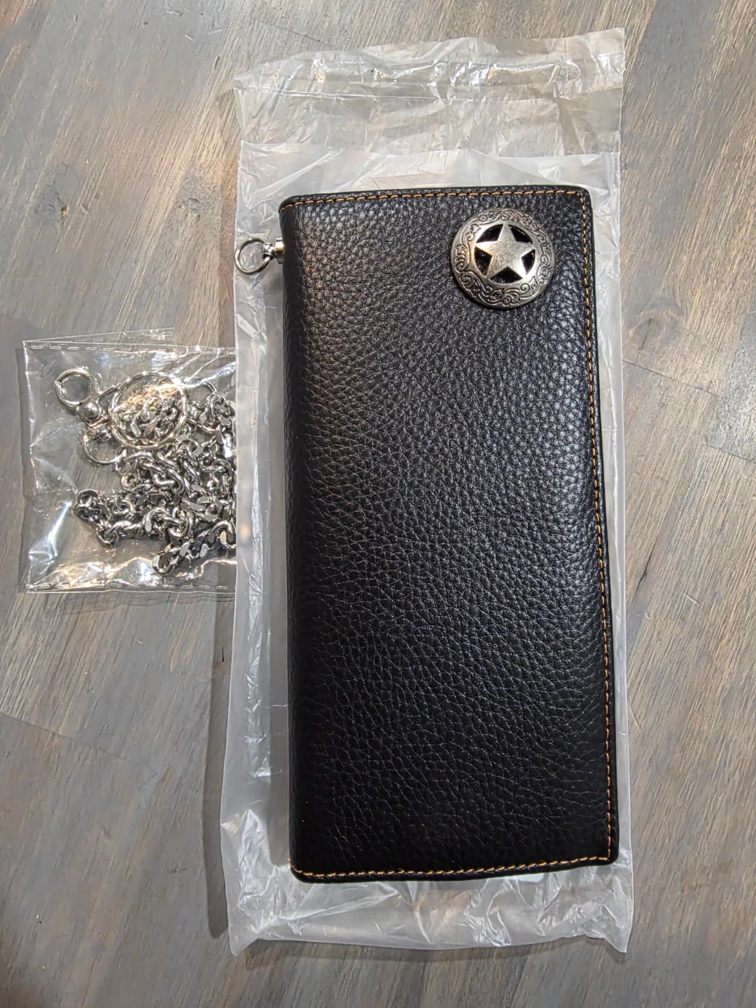 I am selling a new Men's long Black Top Grain Leather wallet with Biker's chain.