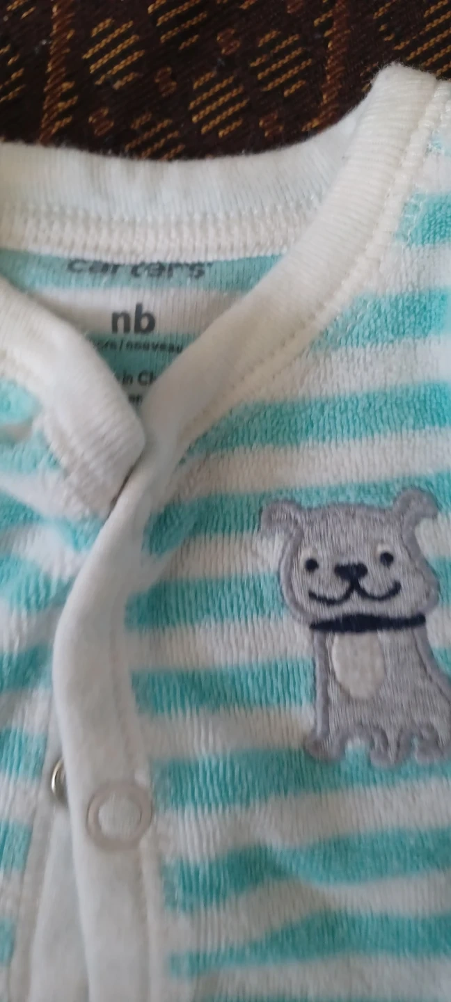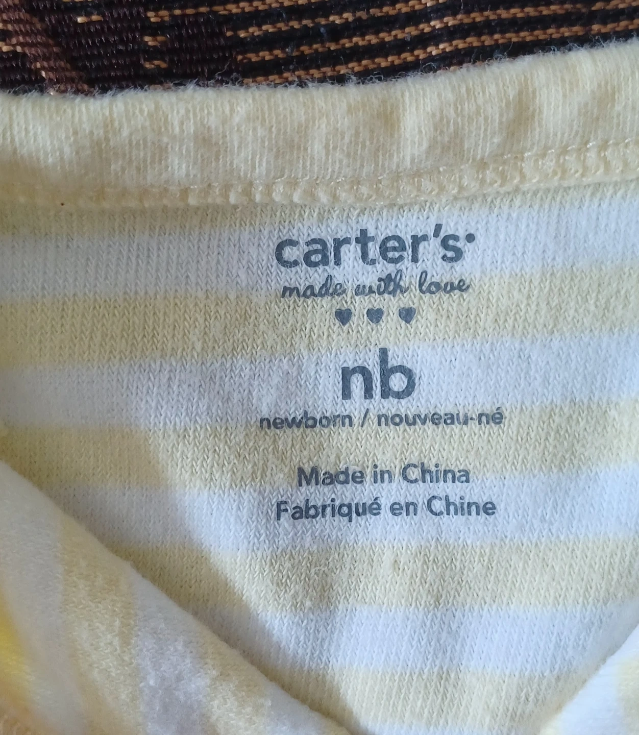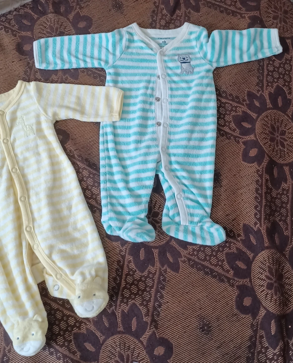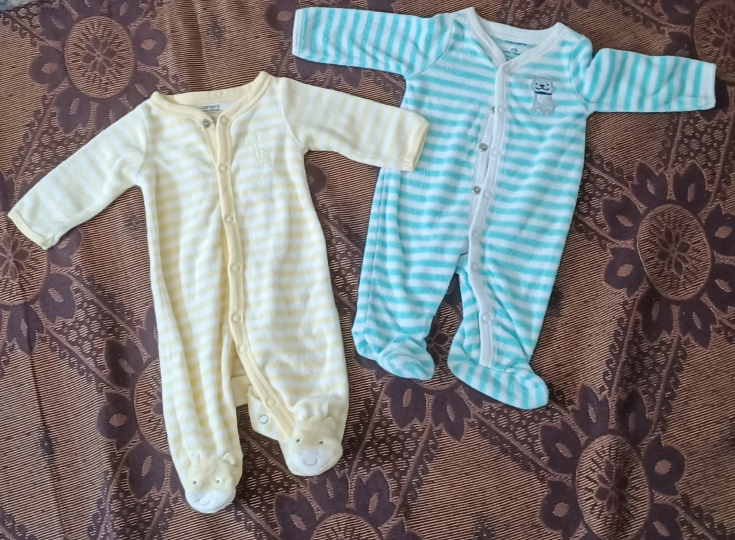 Two Carter's newborn "nb" size sleepers. One is yellow and white striped, the other is blue and white striped. Both feature snap closures down the front and footies.$5 for both.