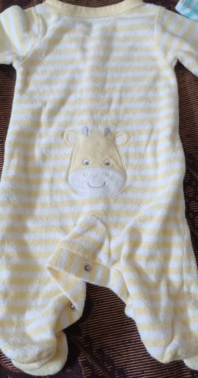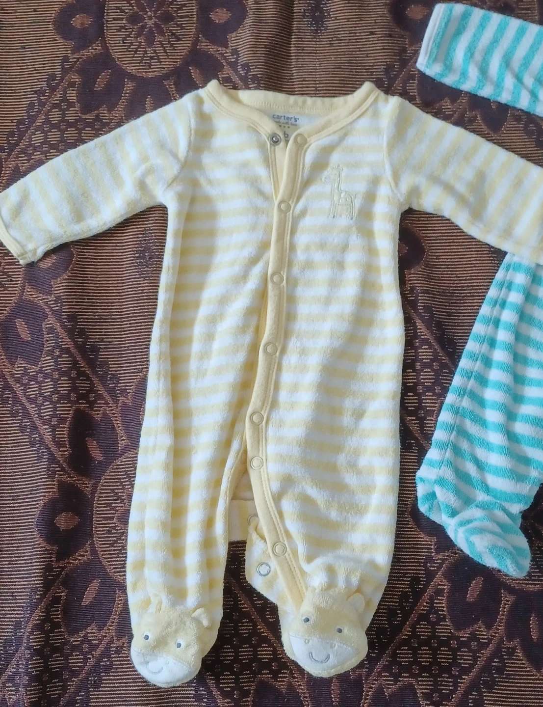 Two Carter's newborn "nb" size sleepers. One is yellow and white striped, the other is blue and white striped. Both feature snap closures down the front and footies.$5 for both.