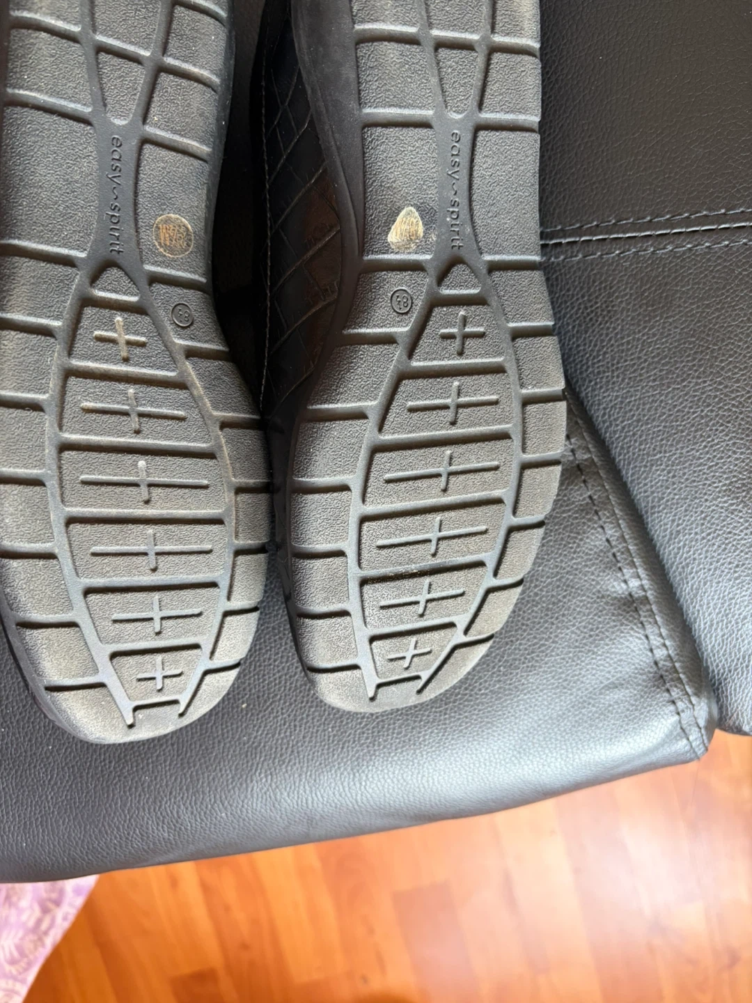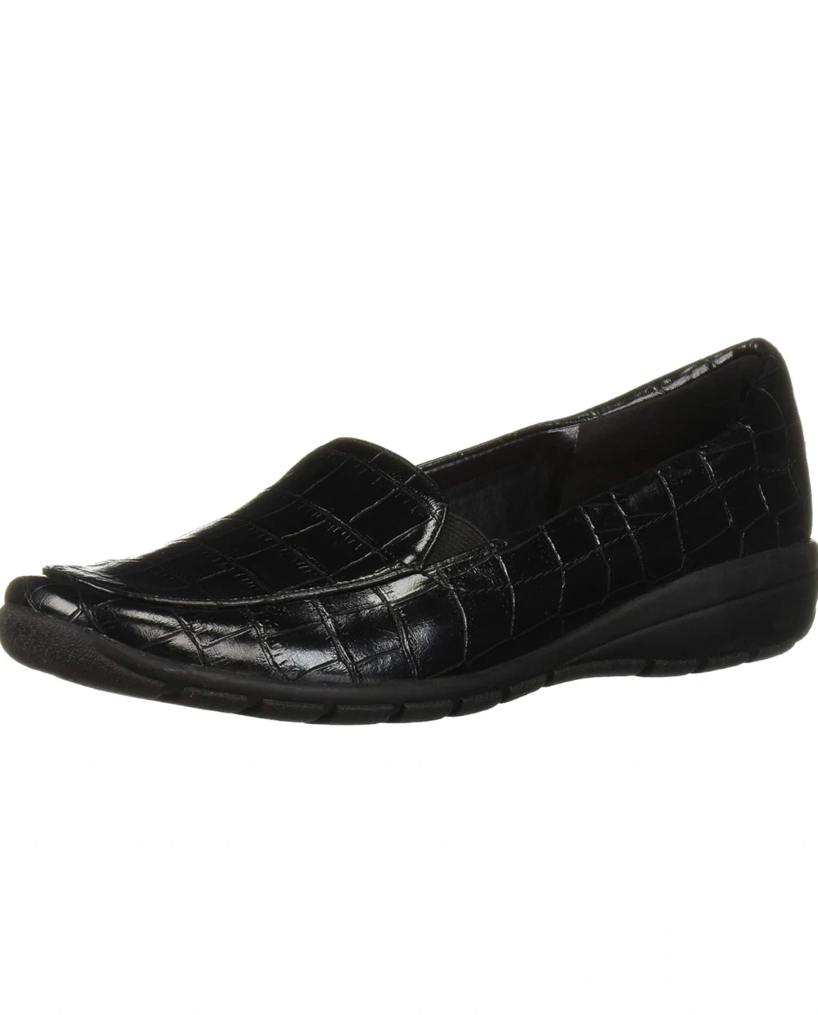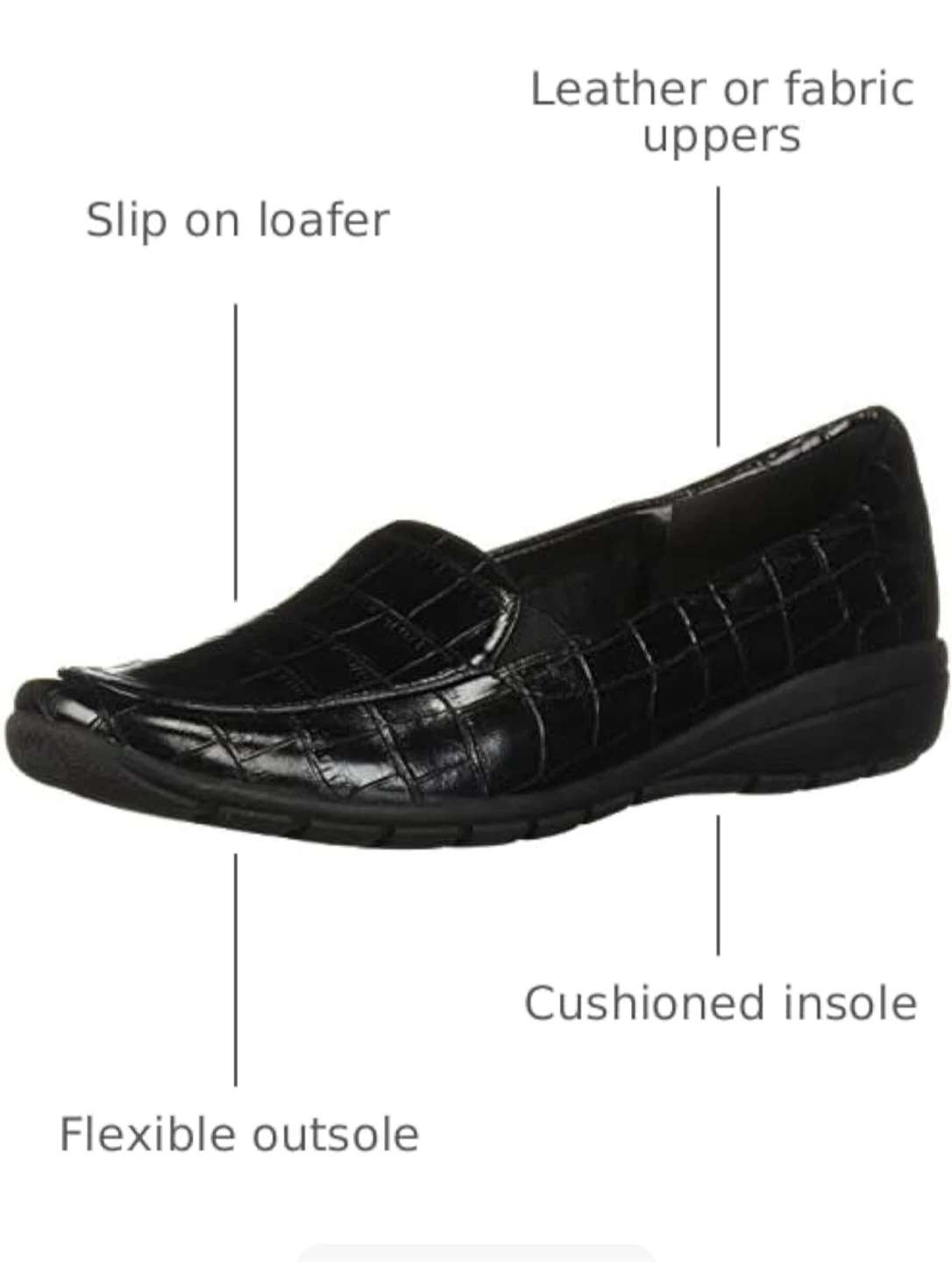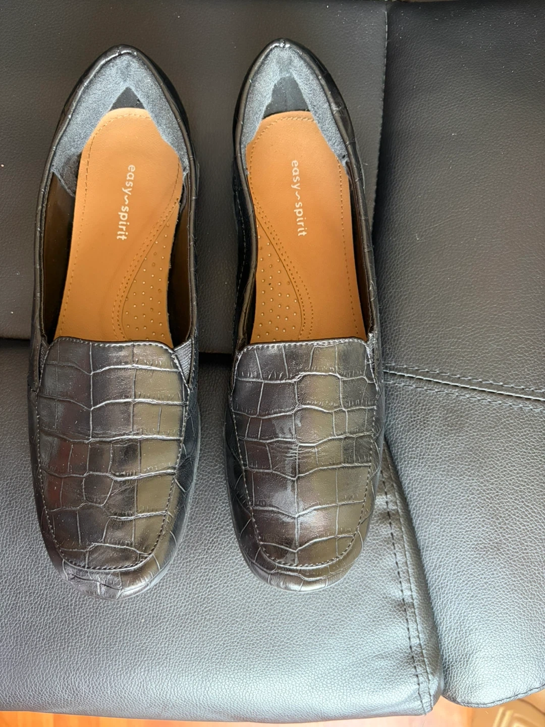 Easy Spirit loafers with a black croc-embossed finish. These slip-on shoes feature leather and a cushioned insole with arch support.
