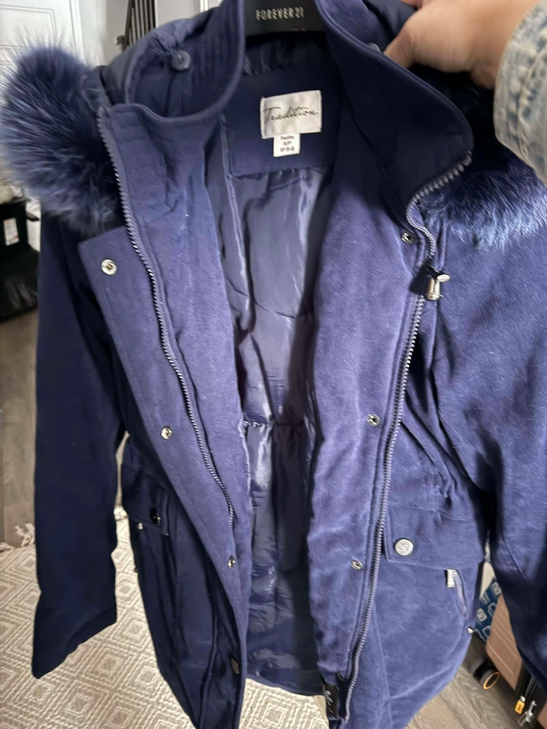 A navy blue winter coat. It features a faux fur trimmed hood and a quilted interior lining. The coat has a drawstring waist for a fitted look. It's a size petite small.