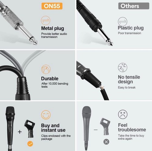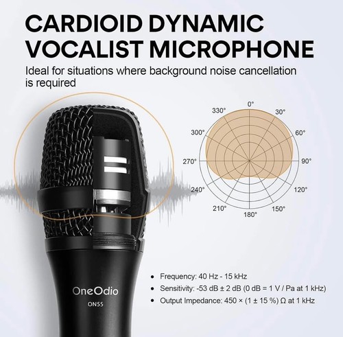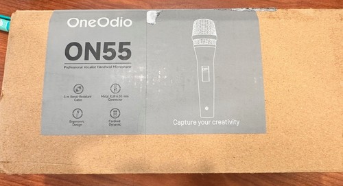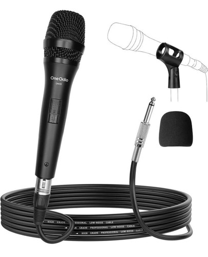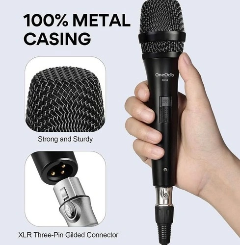This is a OneOdio ON55 wired dynamic vocal microphone, great for singing, karaoke, and speech. It features a cardioid pickup pattern for good off-axis rejection, reducing background noise. The built-in pop filter and mesh grille help protect against wind and plosives for clear sound. It has a durable metal casing and grille, making it comfortable to hold and resistant to scratches. The microphone comes with a 16ft XLR to 1/4" cable for connecting to karaoke machines, amplifiers, portable speakers, and other audio devices. It's also suitable for public speaking and recording studios. Package includes: Handheld Dynamic Vocal Microphone x 1, 16ft XLR Cable x 1, Microphone Clip x 1.