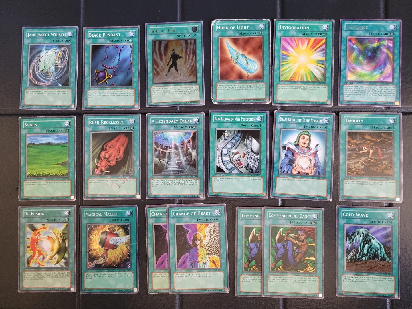 Lot of 19 vintage Yu-Gi-Oh Spell/Magic cards from early 2000s sets.