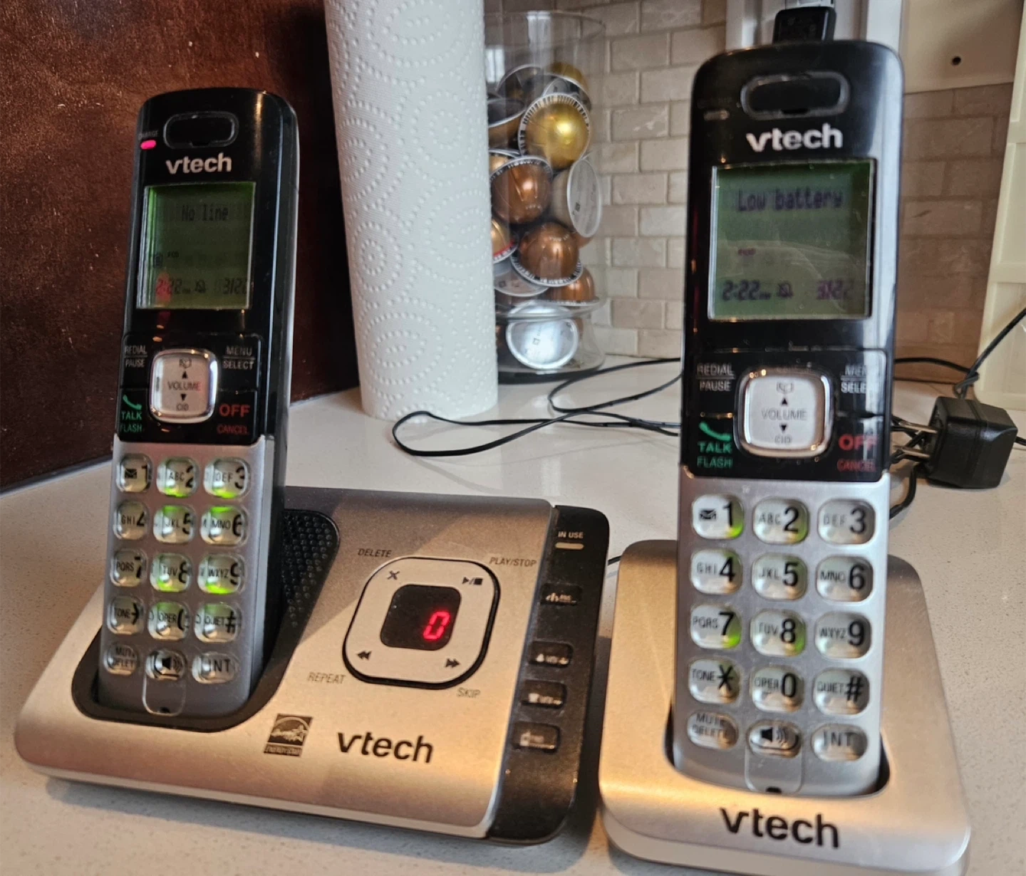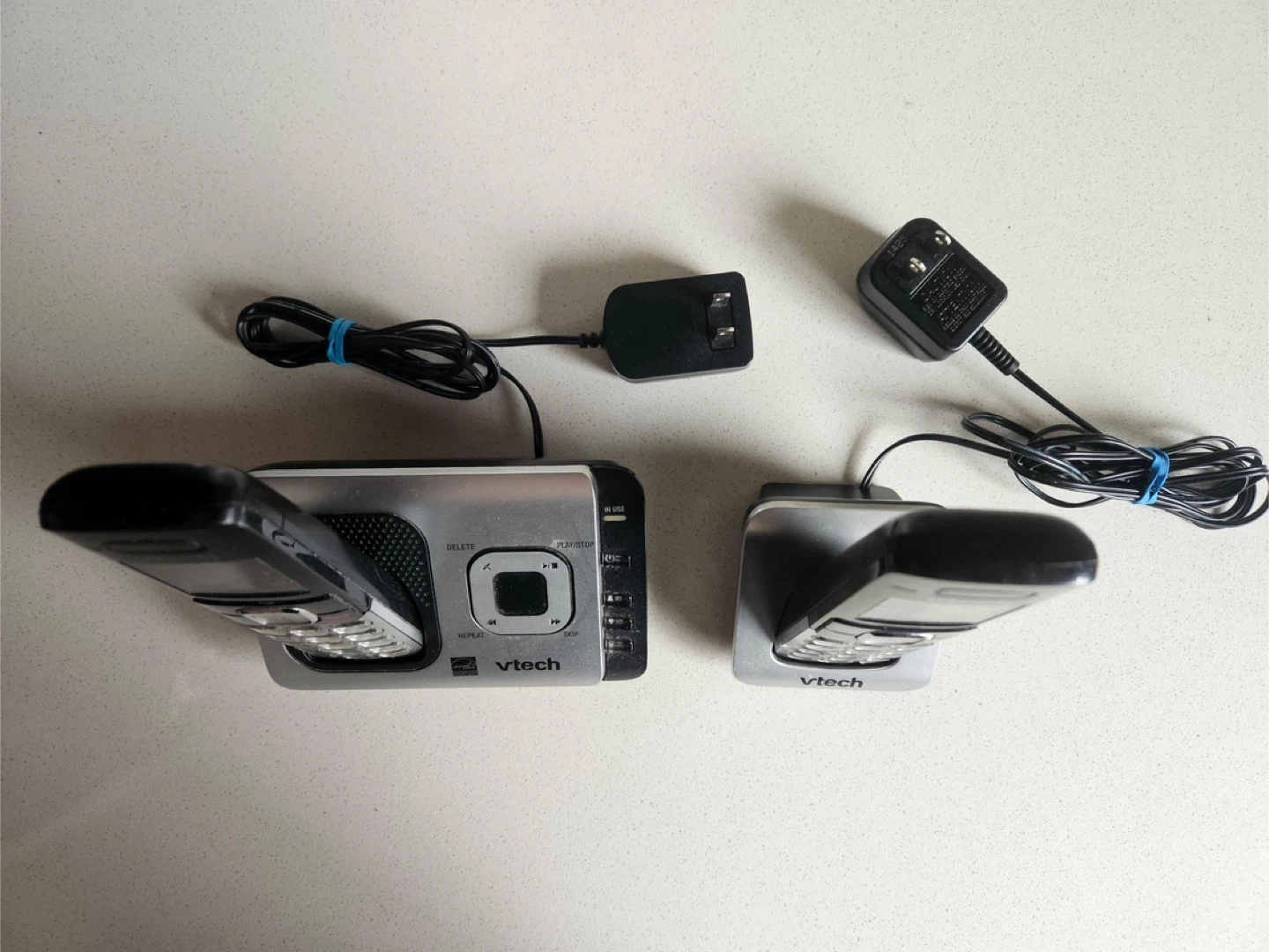 Includes 2 handsets + answering machine, charging docks and power adapters!