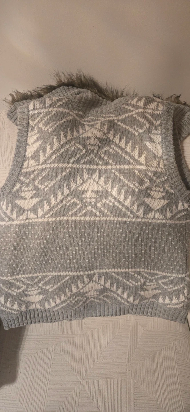 This is a cozy knit sweater vest featuring a grey and white geometric pattern. It has faux fur trim around the hood and collar, along with wooden toggle closures. Perfect for a warm cozy layer in a cold day.