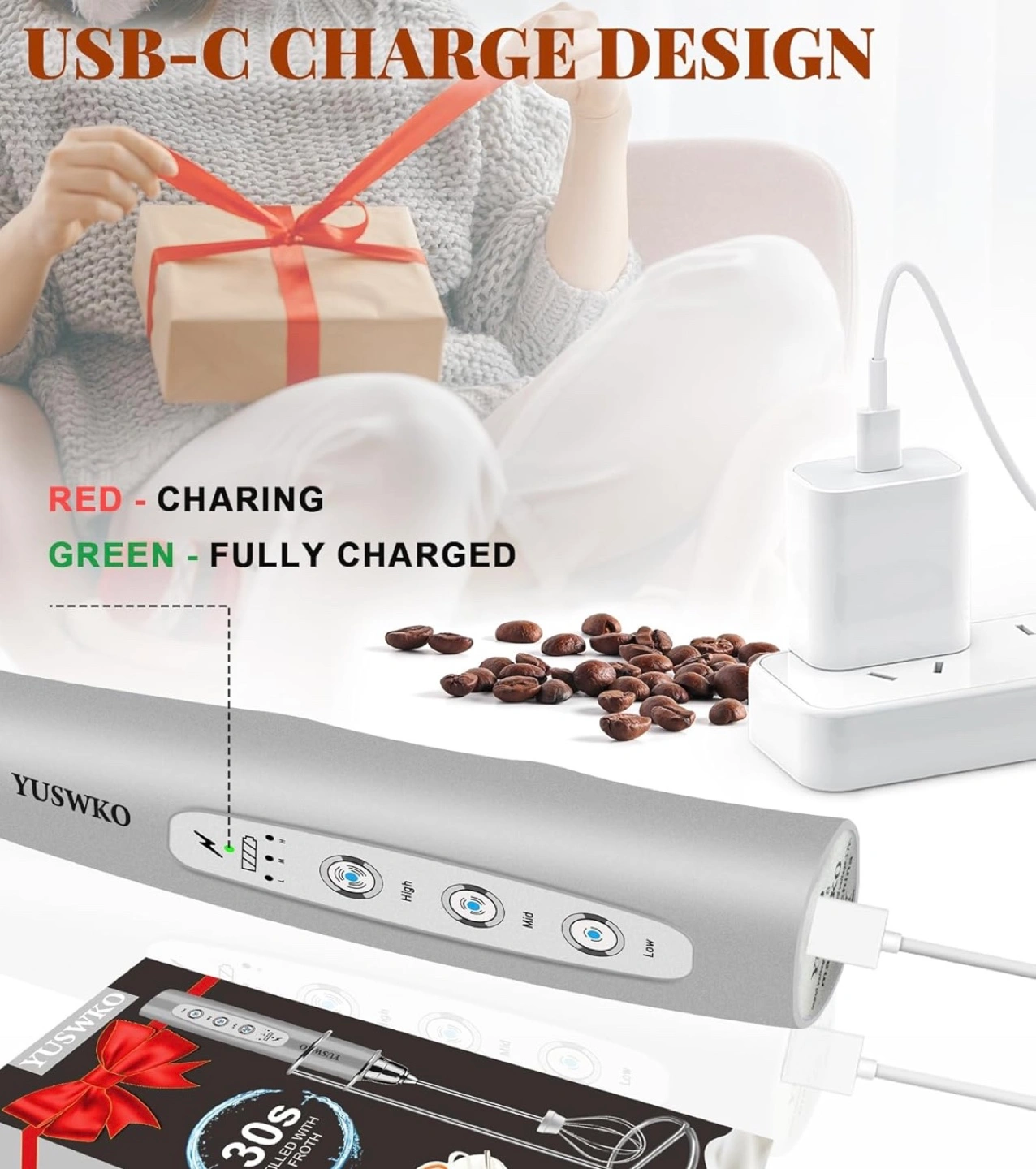 YUSWKO USB Rechargeable Electric Milk Frother with stand
