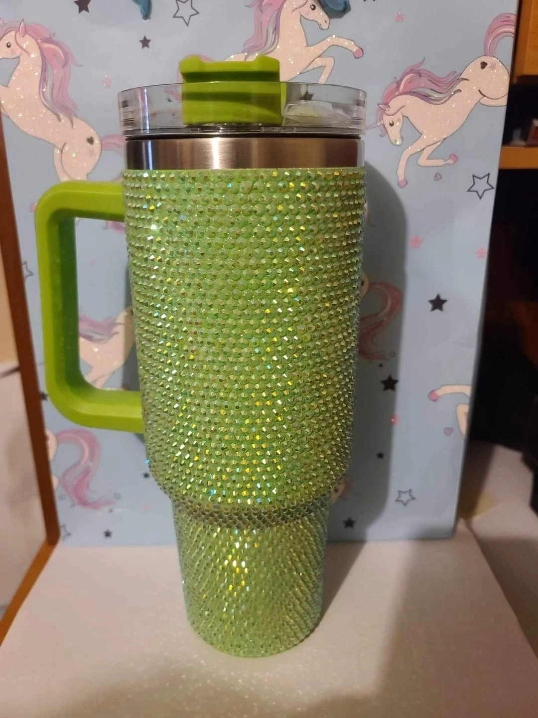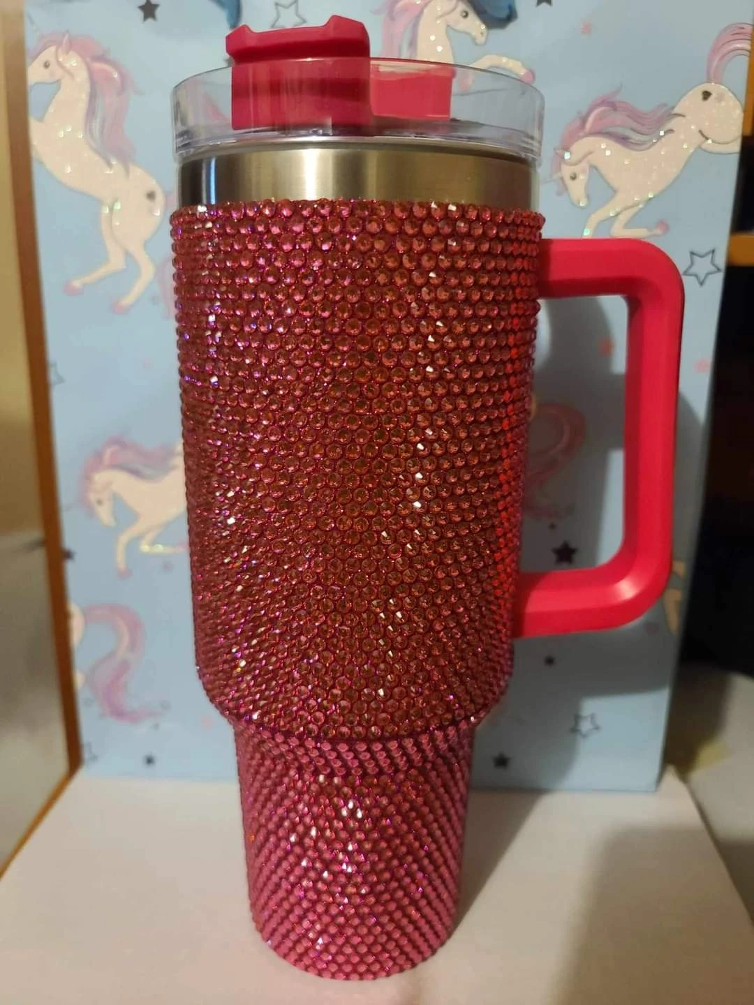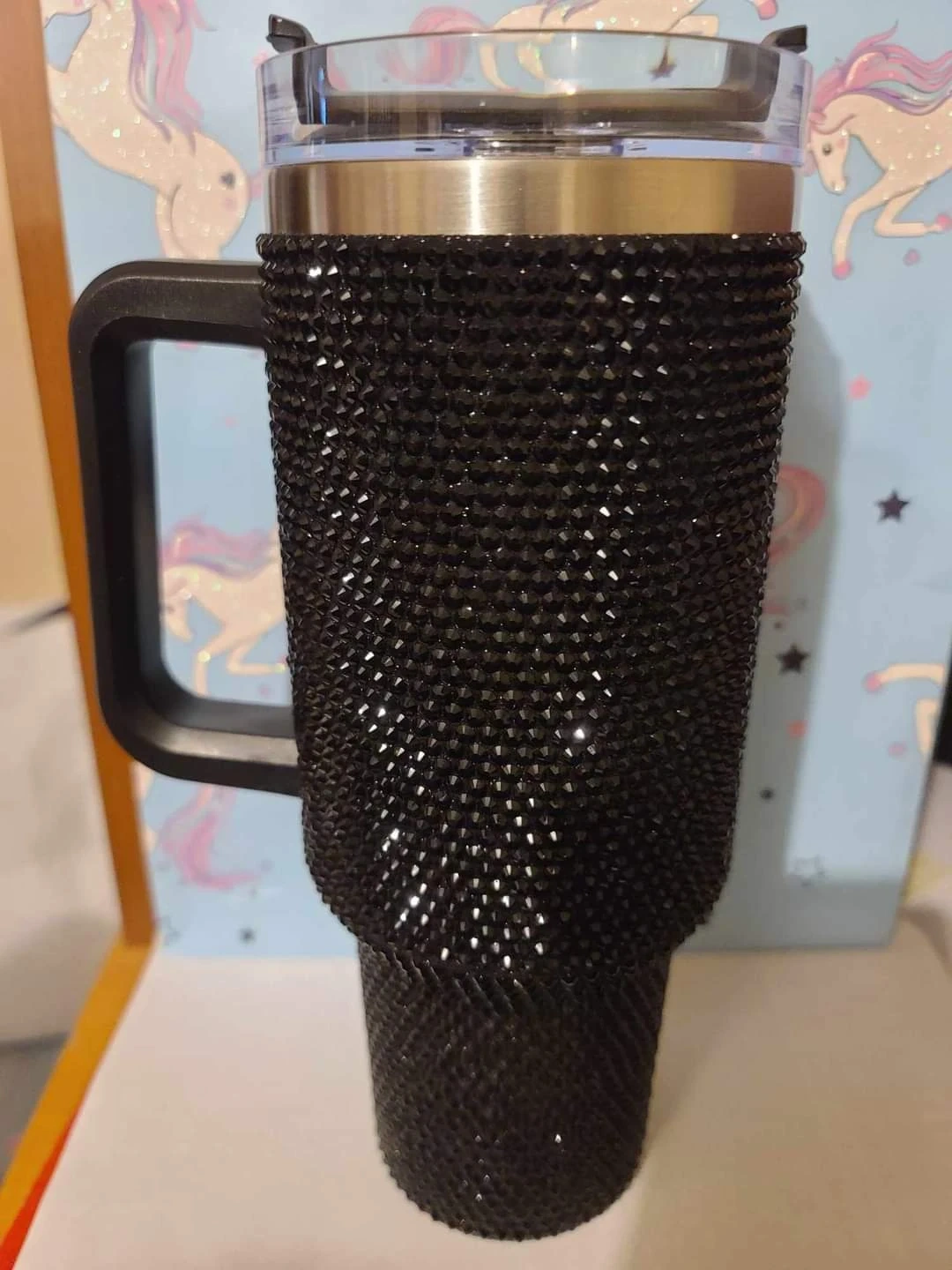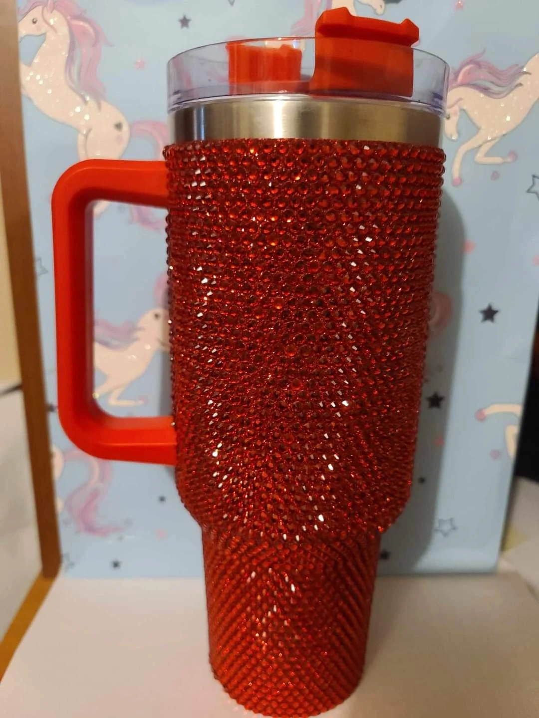Check out these beautiful rhinestone tumblers! They come in a variety of colours including red, black, purple, and iridescent. They have a handle and a lid with a straw opening. Perfect for keeping your drinks cold or hot!
