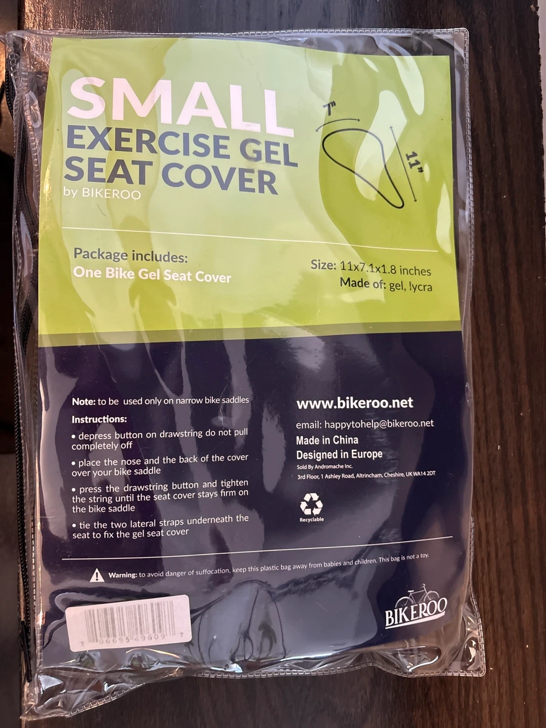 This is a small gel seat cover for exercise bikes. It's made of gel and lycra. The size is 11x7.1x1.8 inches. It includes an original box.