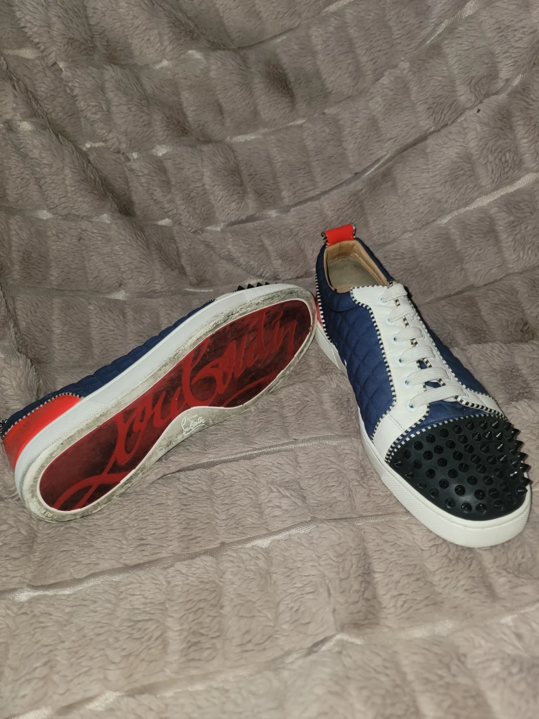 These Christian Louboutin Louis trainers feature the iconic spikes on the toe. They're made with a quilted blue and white upper with red accents. The signature red sole is present on both shoes.
