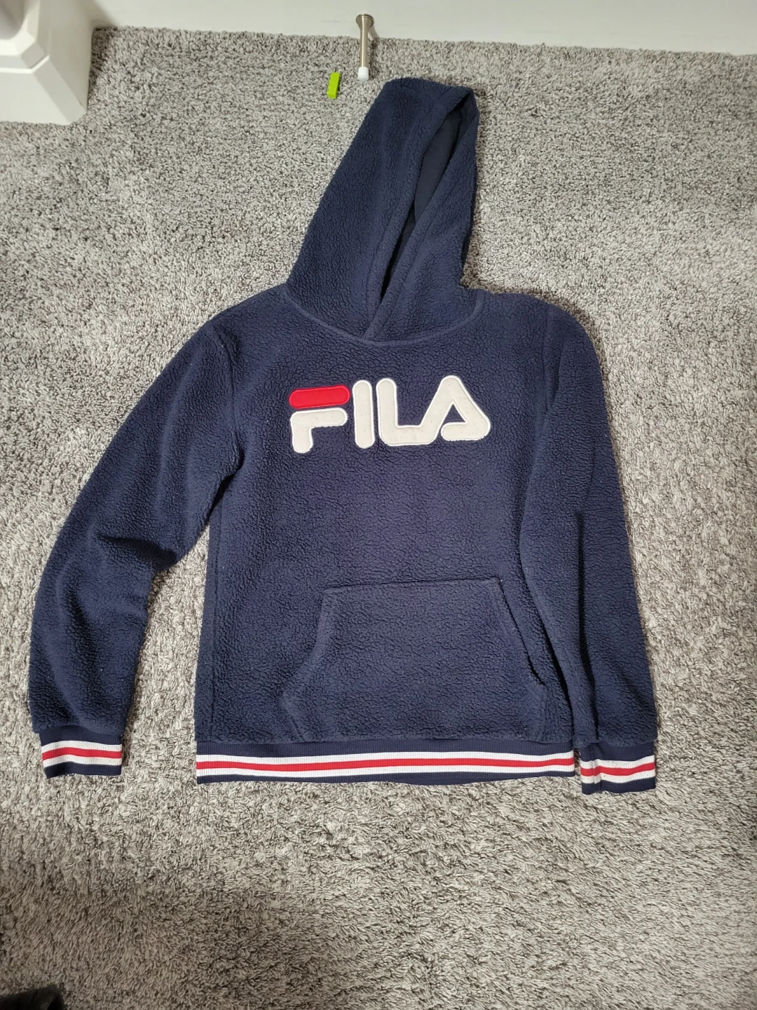 Navy blue Fila sherpa hoodie. It's a size XL (14/16) with a front kangaroo pocket and ribbed cuffs and hem. Soft sherpa material.