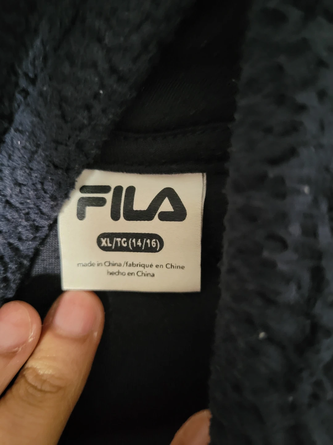 Navy blue Fila sherpa hoodie. It's a size XL (14/16) with a front kangaroo pocket and ribbed cuffs and hem. Soft sherpa material.