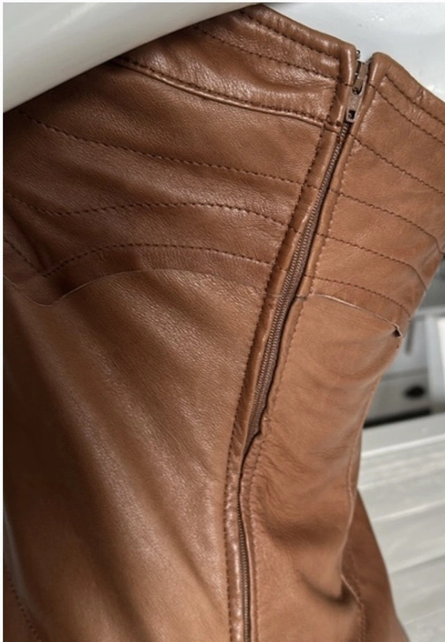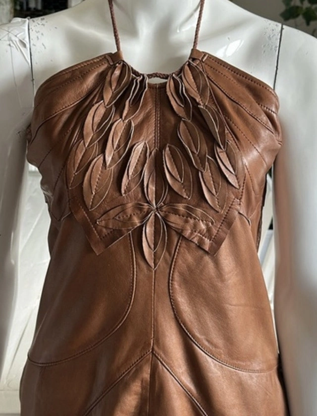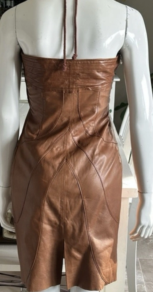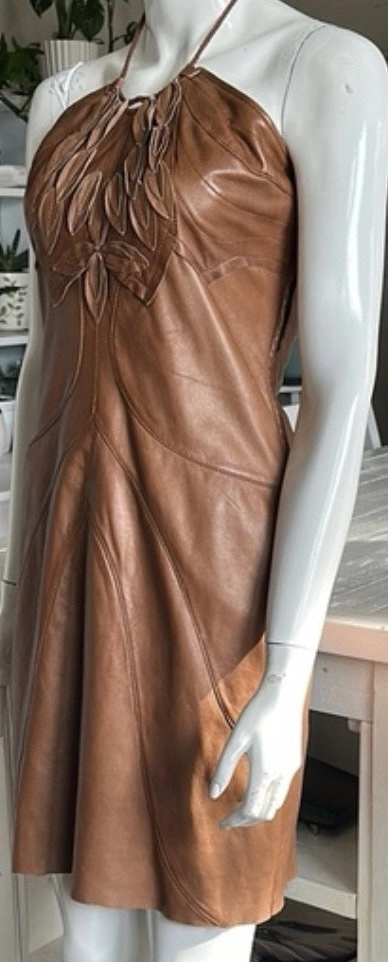 Brand new Danier halter dress with tags attached, from a smoke-free home. Size 2. Length: 31" (79 cm), Chest: 30" (76 cm). Color: Saddle/Tan. Made from 100% genuine lamb leather, it's incredibly soft and has a stunning feel. Fully lined with a straight-cut hem. Features a unique leaf design and a long zipper on the left side. Original retail price was $499 plus tax.