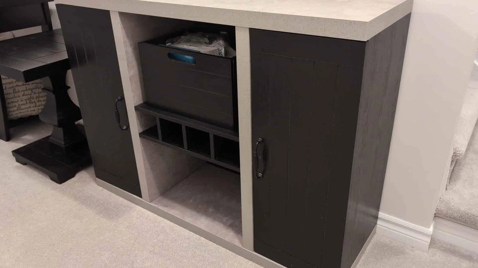 Black and grey bar table. Very lightly used, no cosmetic marks. Includes storage basket and two shelves in each side cupboard. We bought it from Wayfair and paid well over $800. Pickup in Kleinburg.