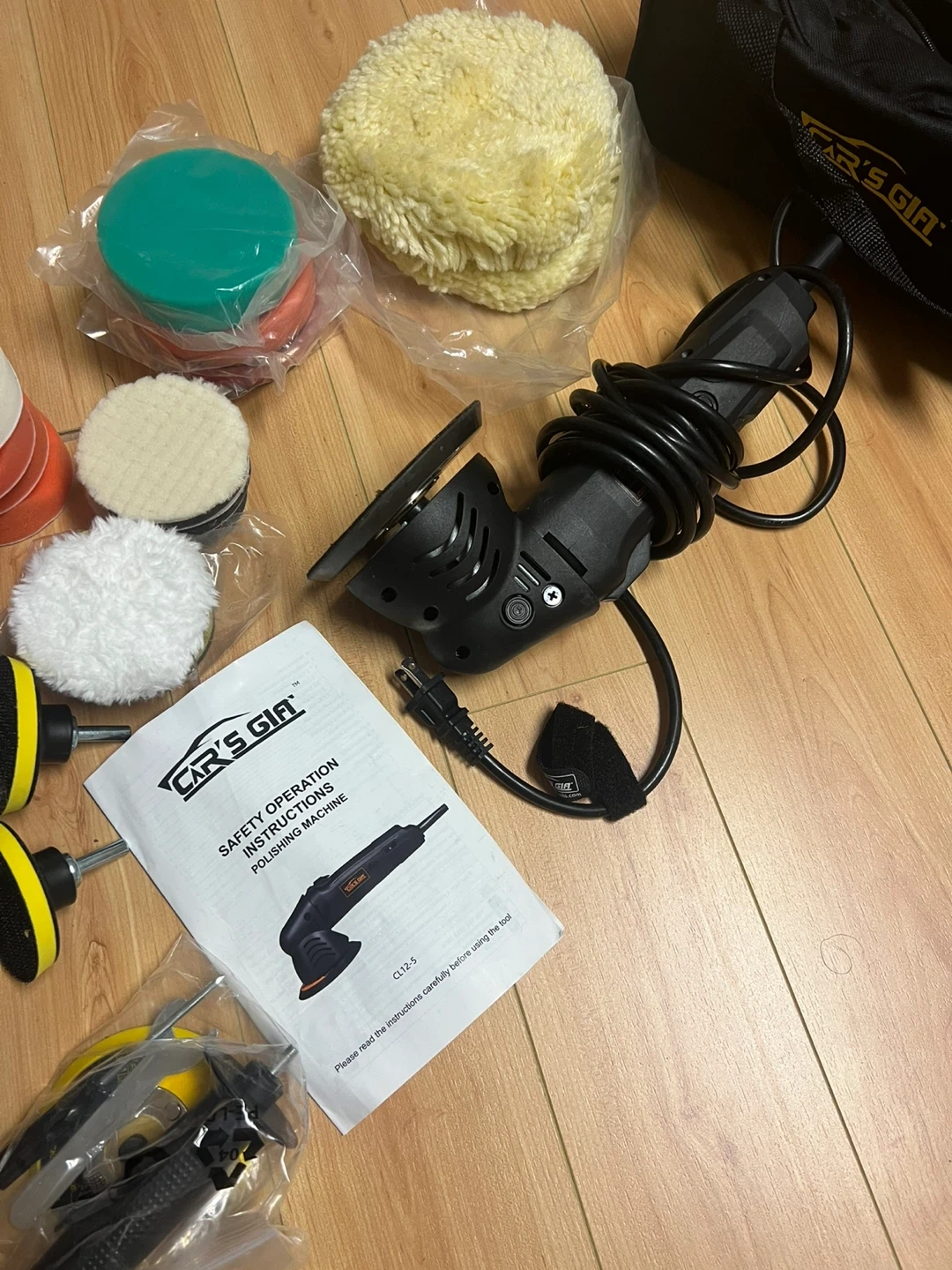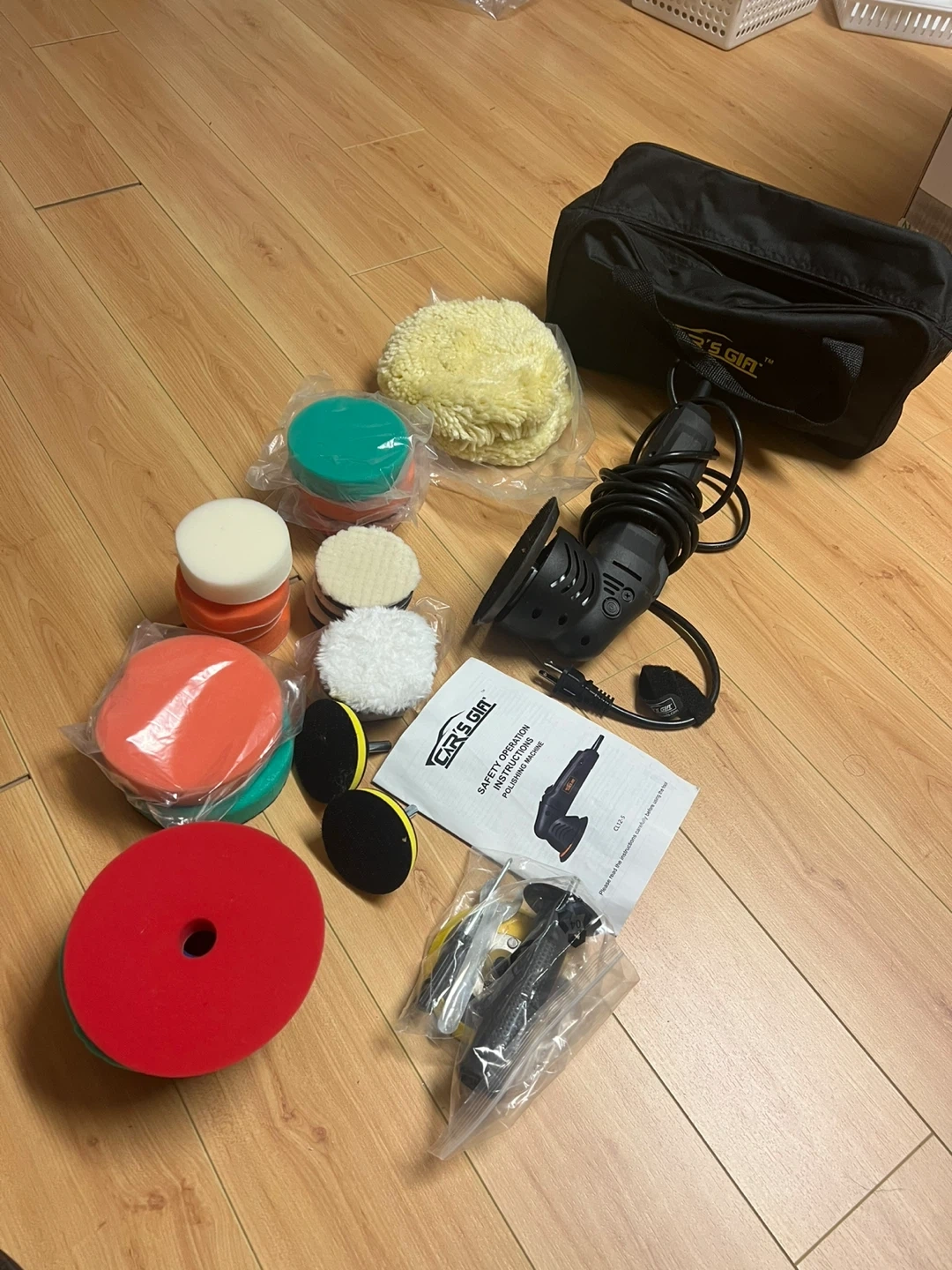 This is a Car's Gia polishing (eccentric orbit )machine and comes with a full set of polishing pads and a carrying bag. It includes various sizes and types of pads for different polishing needs. The machine itself is compact and appears to be a dual-action polisher.