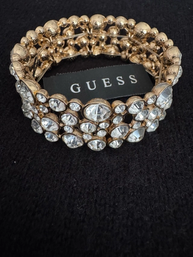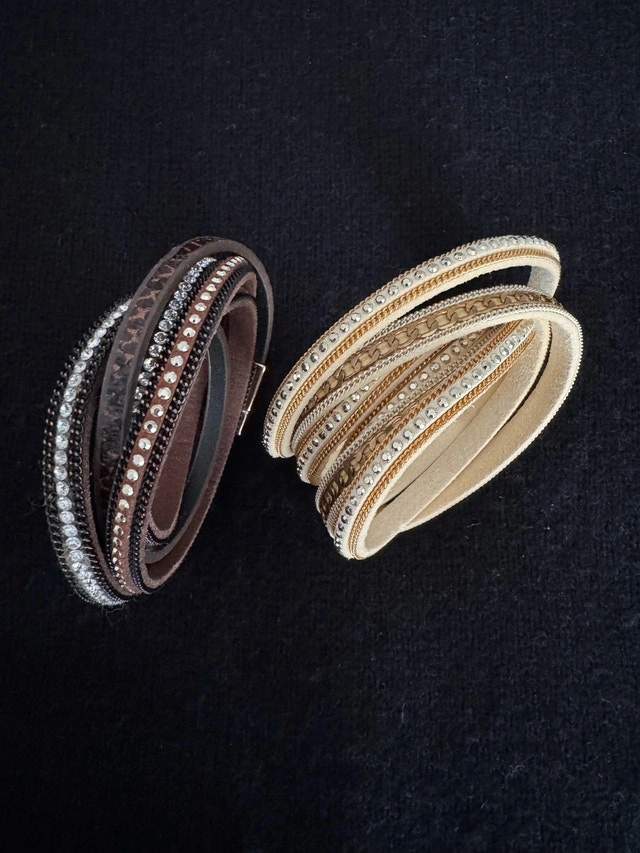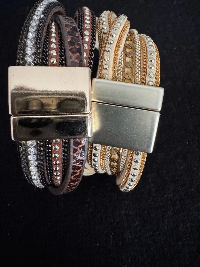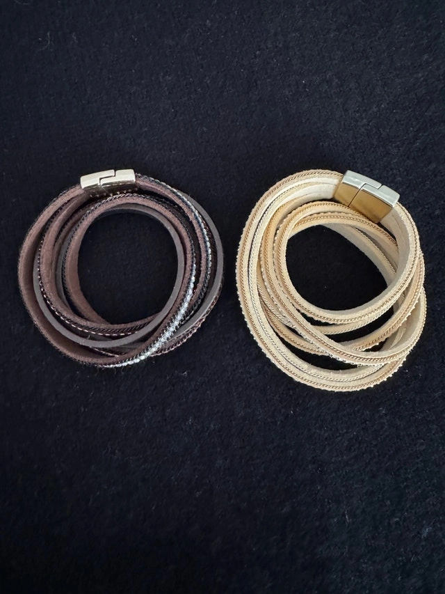 Brand new Guess expandable bracelet $70. Brand new genuine leather bracelets with magnetic closure - brown and cream $25 each. Gently used blue/white and mocha/white bracelets with glass beads $15 each.