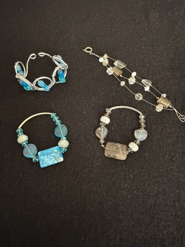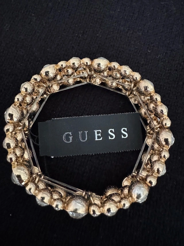 Brand new Guess expandable bracelet $70. Brand new genuine leather bracelets with magnetic closure - brown and cream $25 each. Gently used blue/white and mocha/white bracelets with glass beads $15 each.