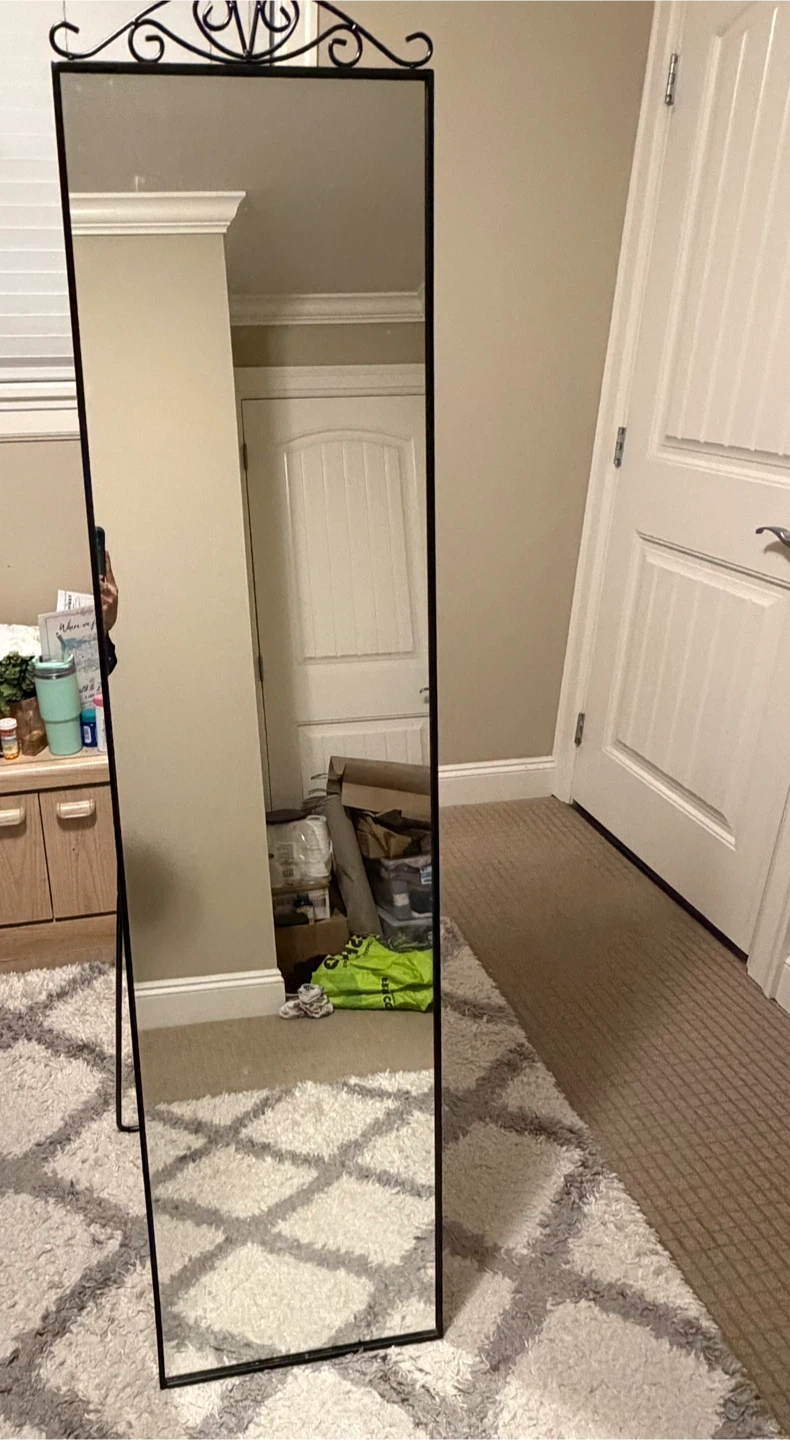 This is a tall, freestanding mirror perfect for checking your outfit. It's got an ornate scrollwork design at the top. The mirror is framed in black metal. This mirror is ideal for a bedroom or dressing area. No cracks nothing. Just got it 8-9 months ago. I just love this tall mirror but im selling it cause iim moving out. You can check the price on ikea website. My last price offered would be 40-45$