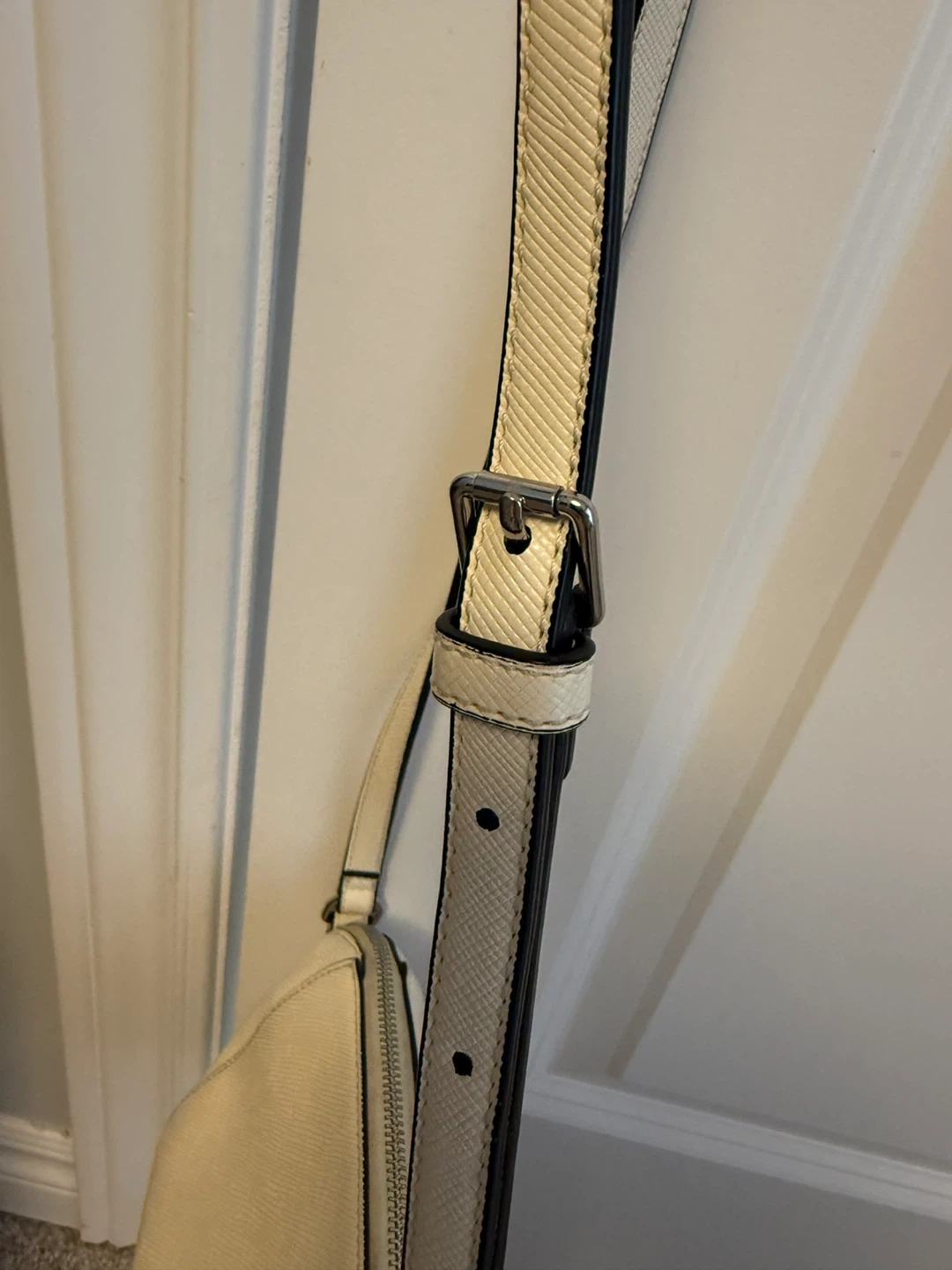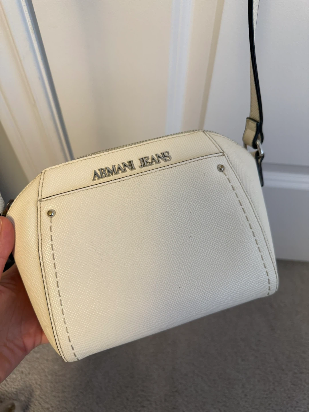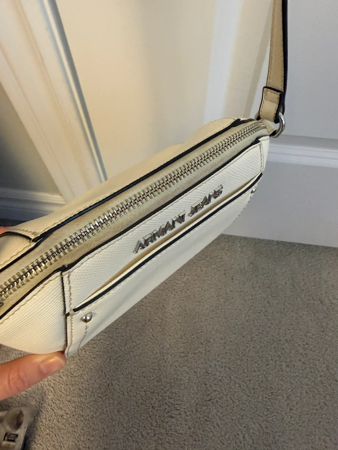 This is a white Armani Jeans crossbody bag. It has a zippered main compartment and a front pocket. The adjustable strap makes it comfortable to wear.