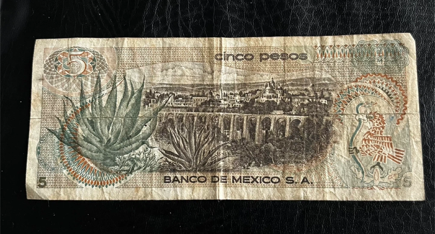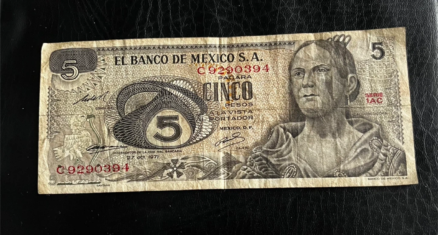 This is a 1971 El Banco De Mexico 5 Pesos circulated paper banknote. It features "Cinco Pesos" on the front and a landscape with an aqueduct on the back. It's dated 27 OCT 1971. This is a collectible item for numismatists.