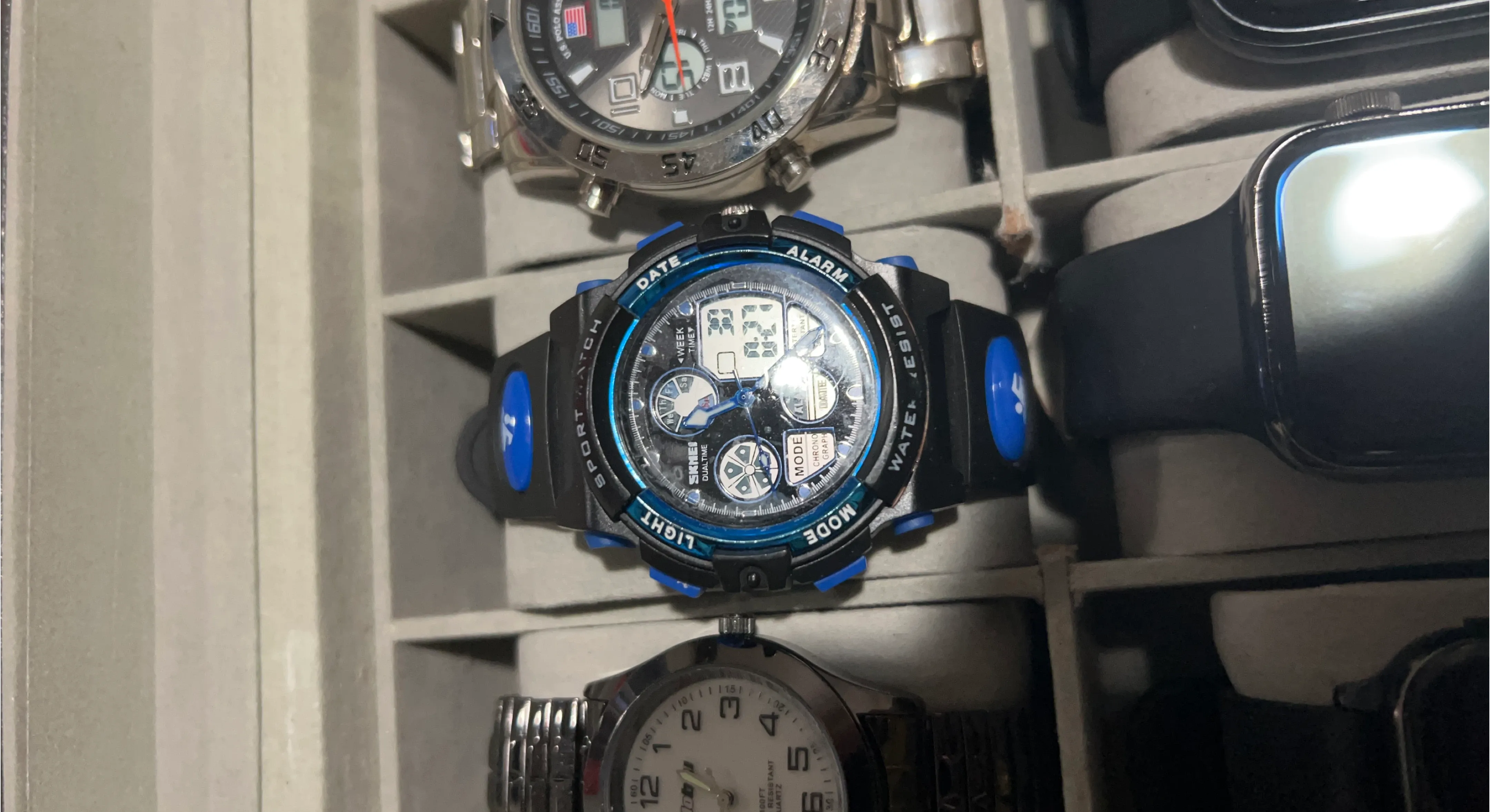 This SKMEI dual time sport watch features alarm, chronograph, and date functions. It's water-resistant up to 100 feet. It's suitable for everyday wear and active pursuits.