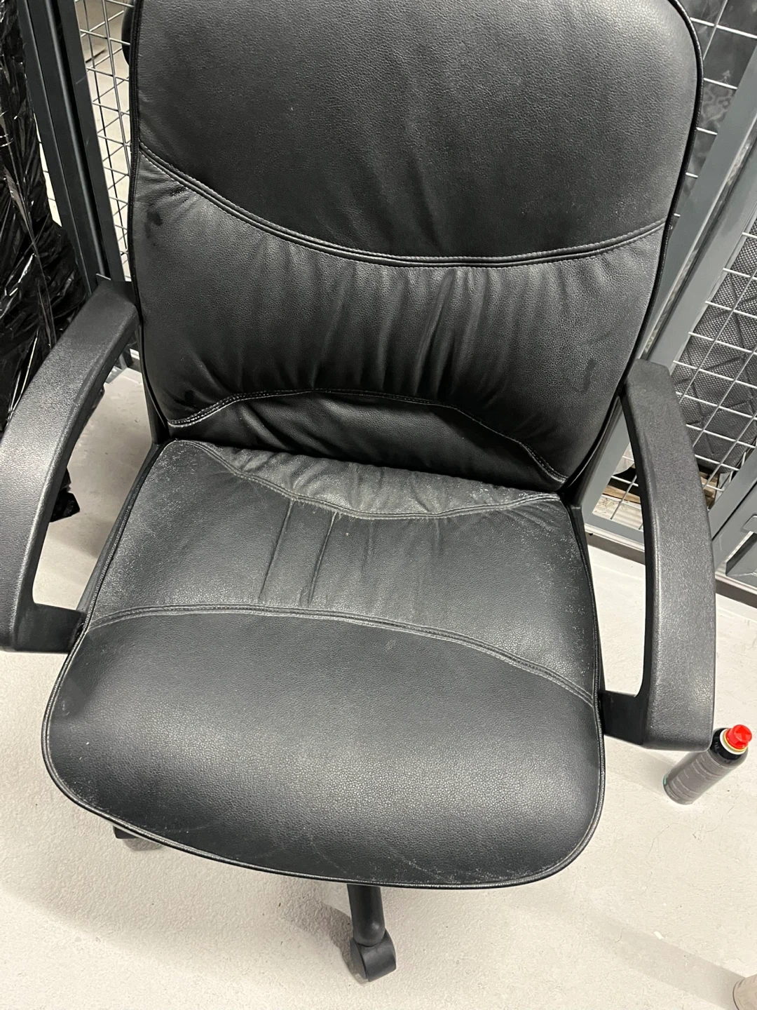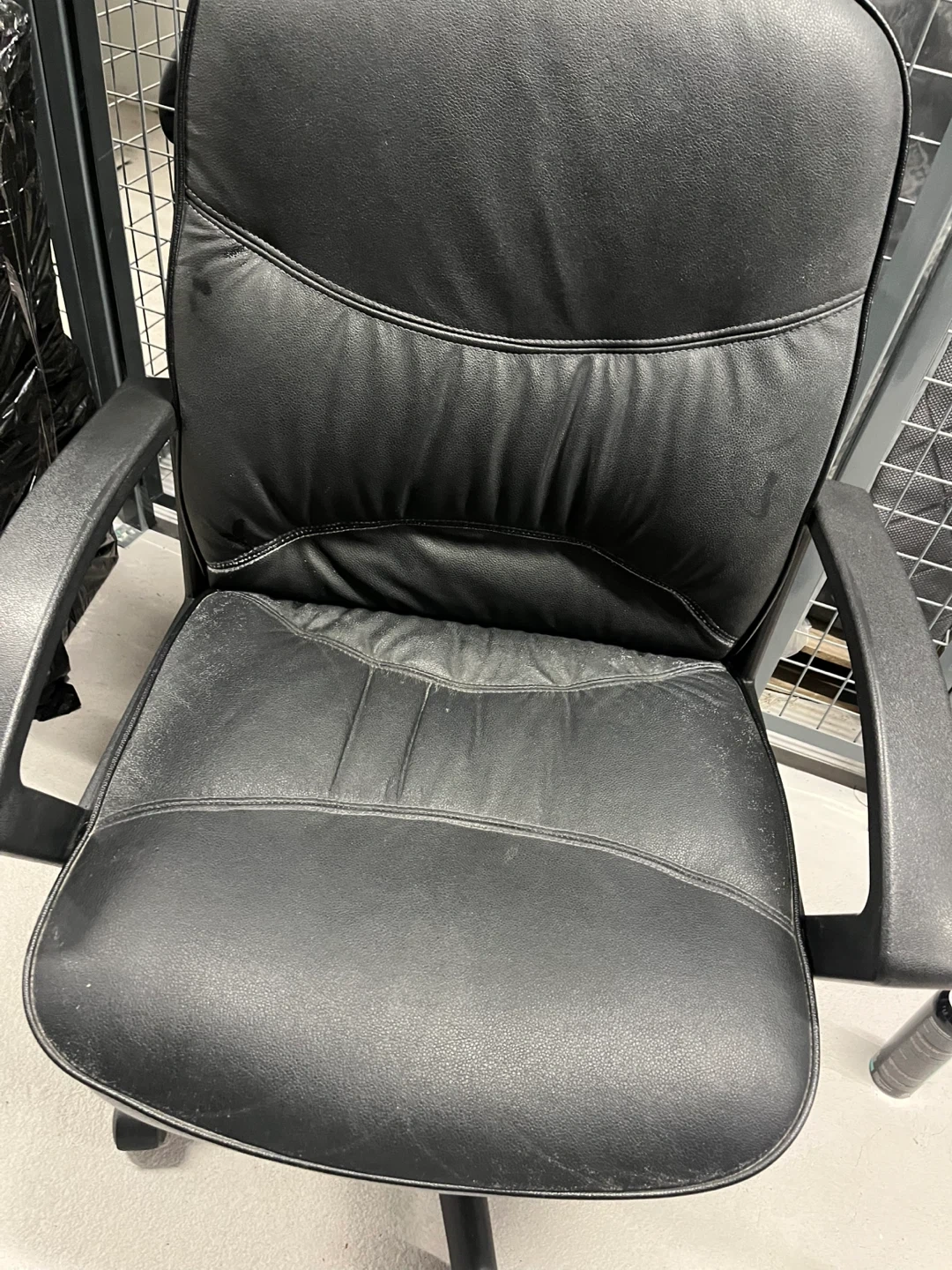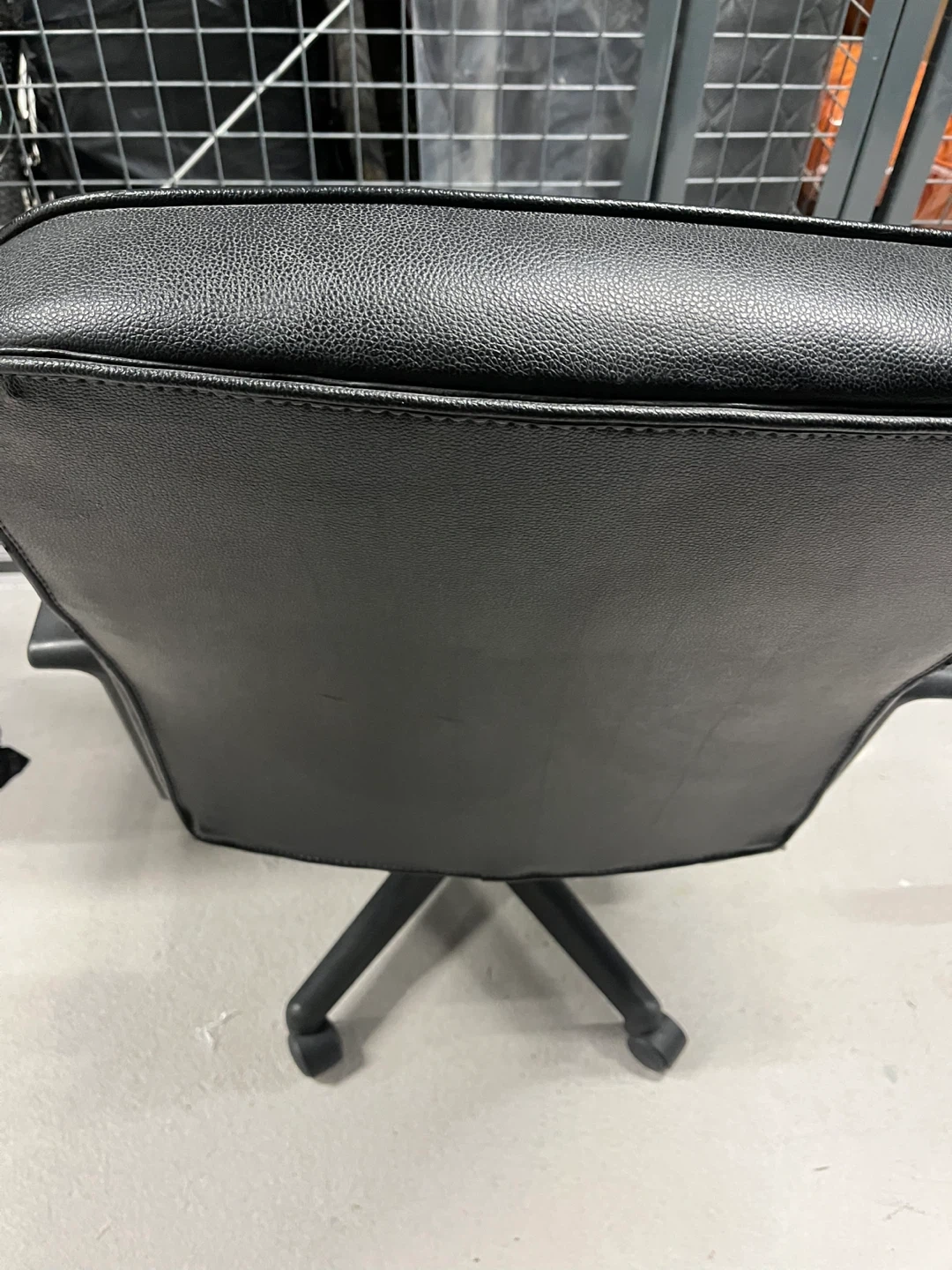 This is a faux leather office chair. It's black with a rolling base and adjustable height. It's a standard office chair that provides seating for desk work.