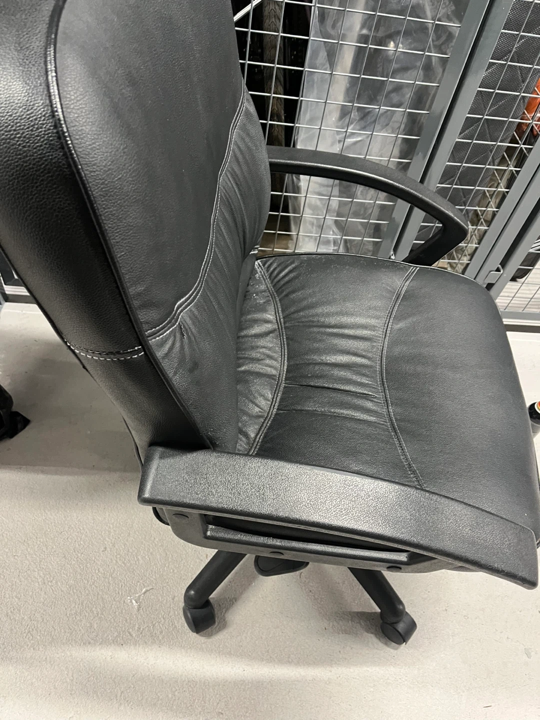 This is a faux leather office chair. It's black with a rolling base and adjustable height. It's a standard office chair that provides seating for desk work.