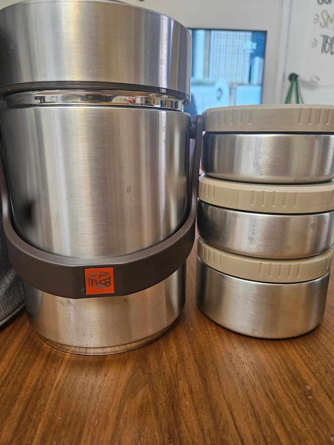 Stainless steel stacking lunch box. Comes with four stackable containers. Includes an insulated gray carrying bag. Perfect for taking meals on the go!