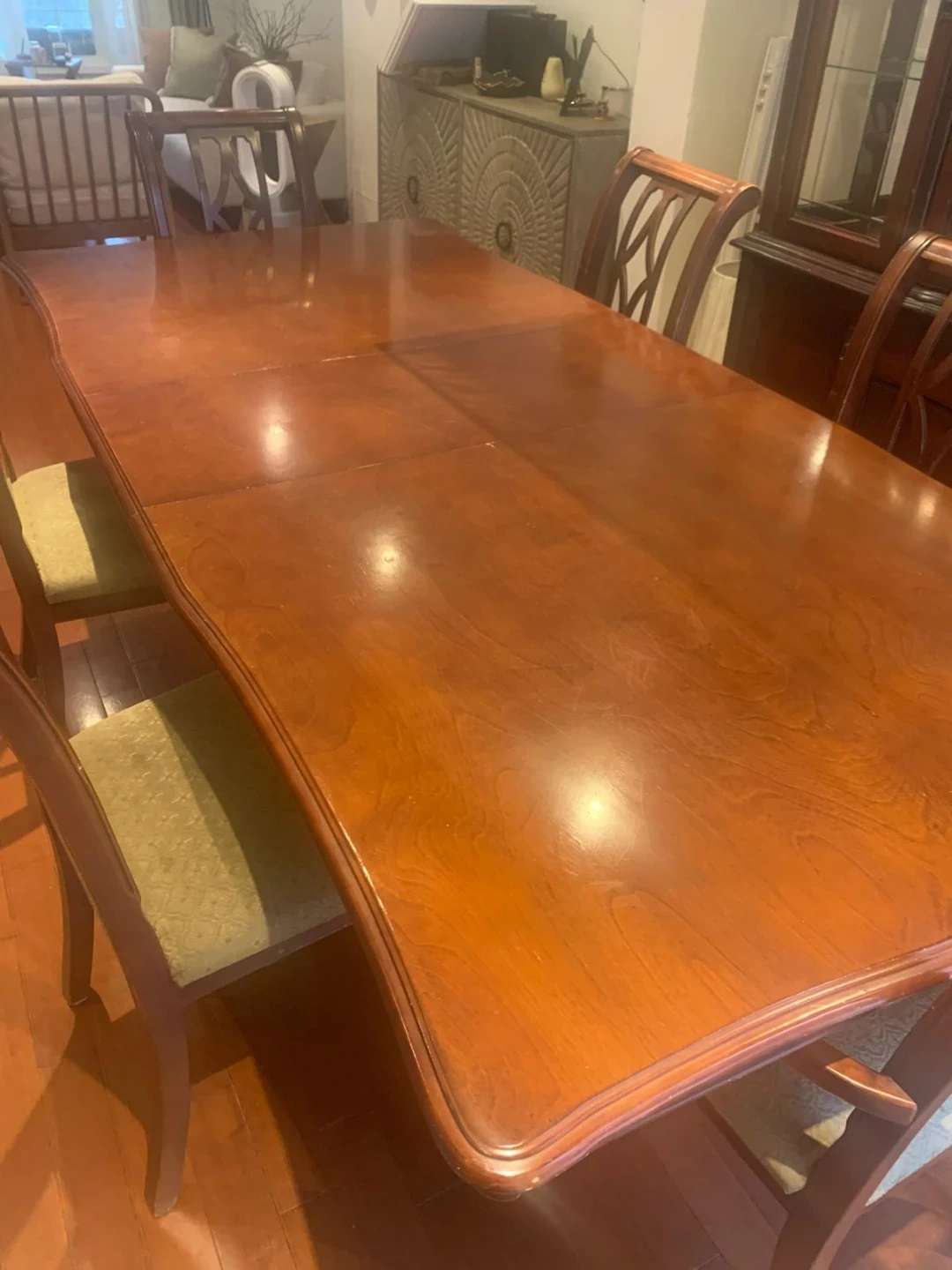 A beautiful cherry wood dining table and matching hutch set. The table has a polished finish and comes with six upholstered chairs. The hutch features glass-paned doors and drawers for storage. It's a great set for family dinners or entertaining guests!